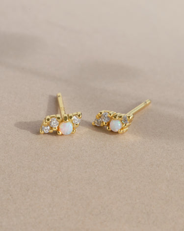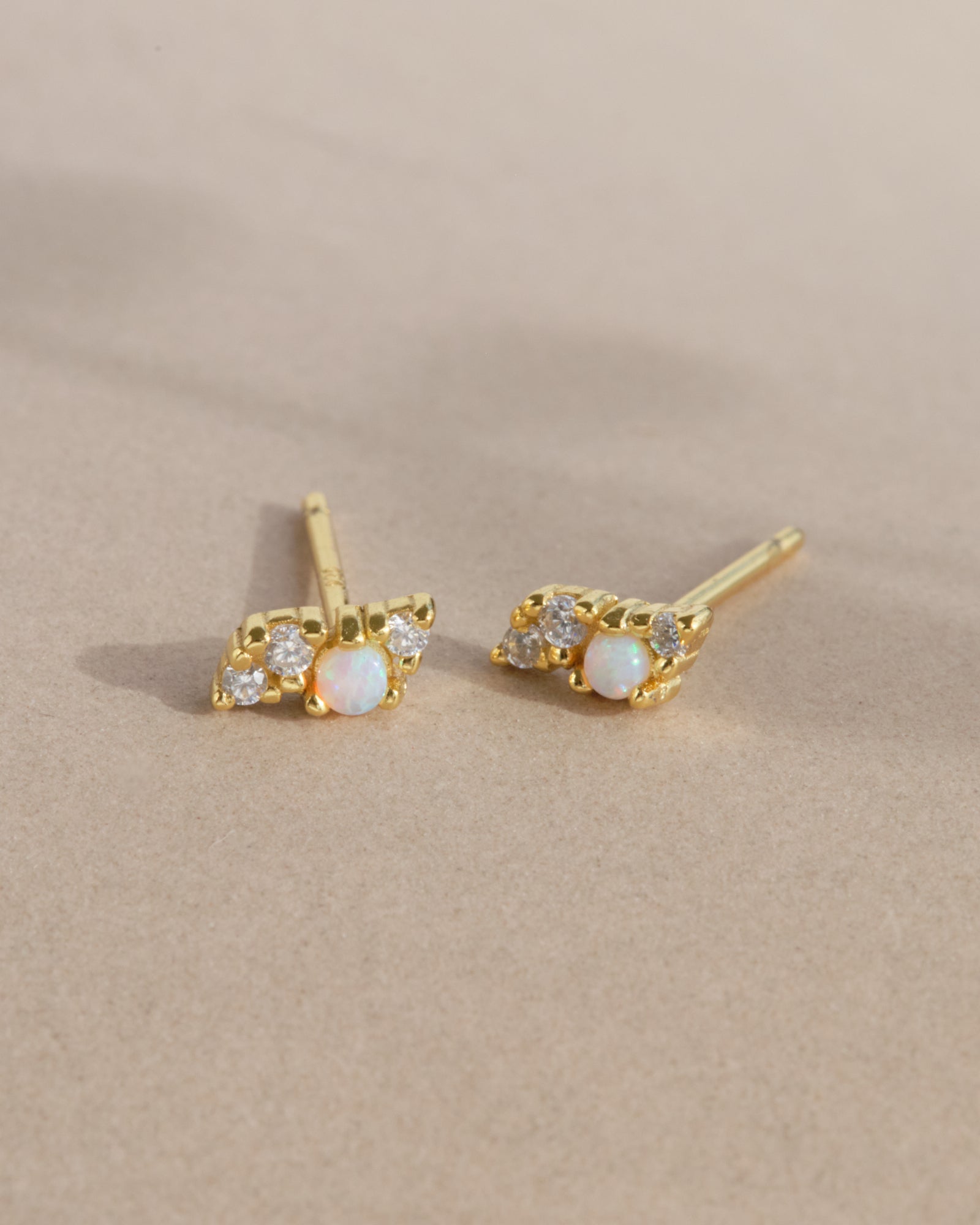 Orecchini a lobo con opale centrale e zirconi bianchi disposti a ventaglio, che creano un delicato gioco di luce. Un design raffinato e versatile, ideale da indossare ogni giorno o per occasioni speciali.