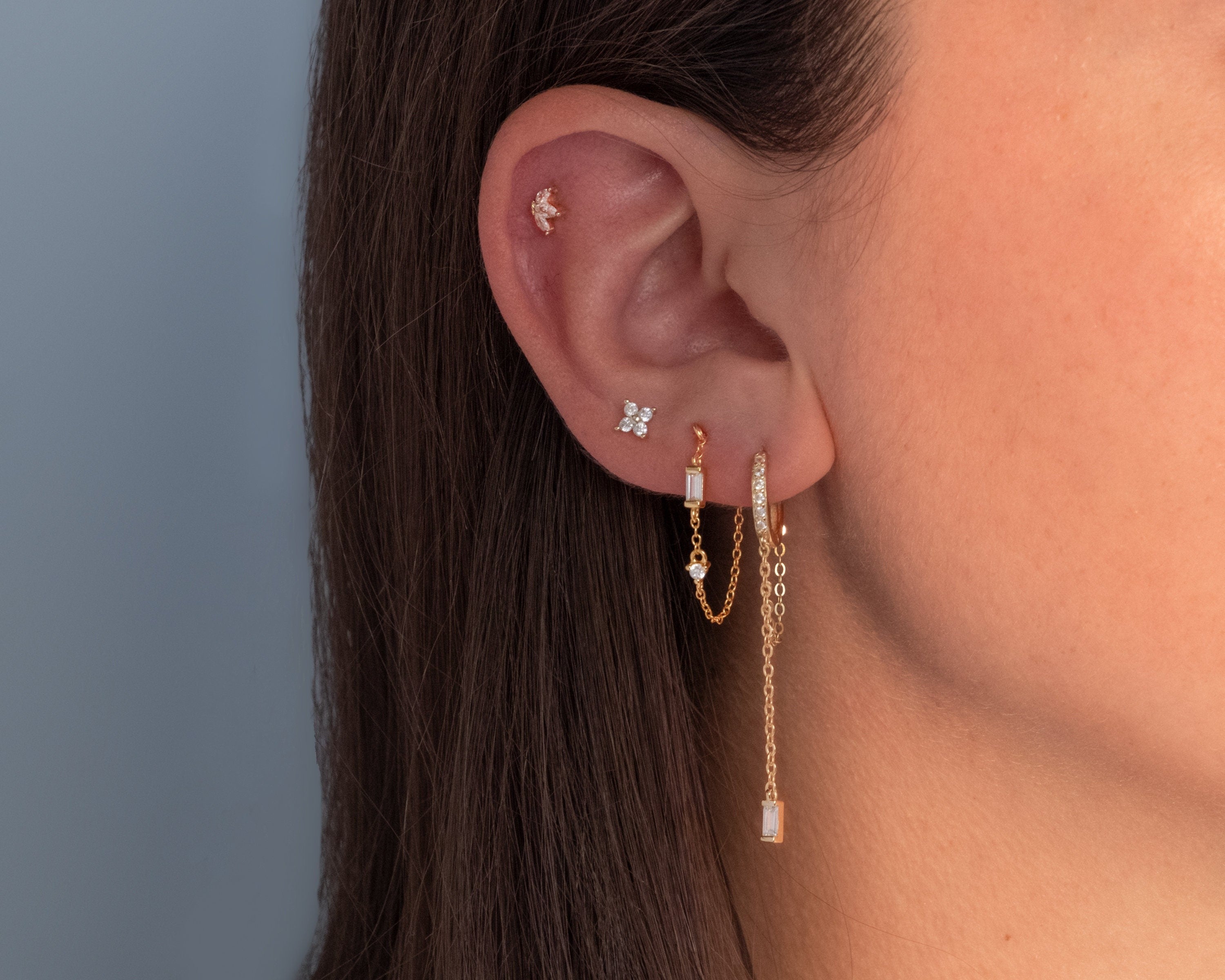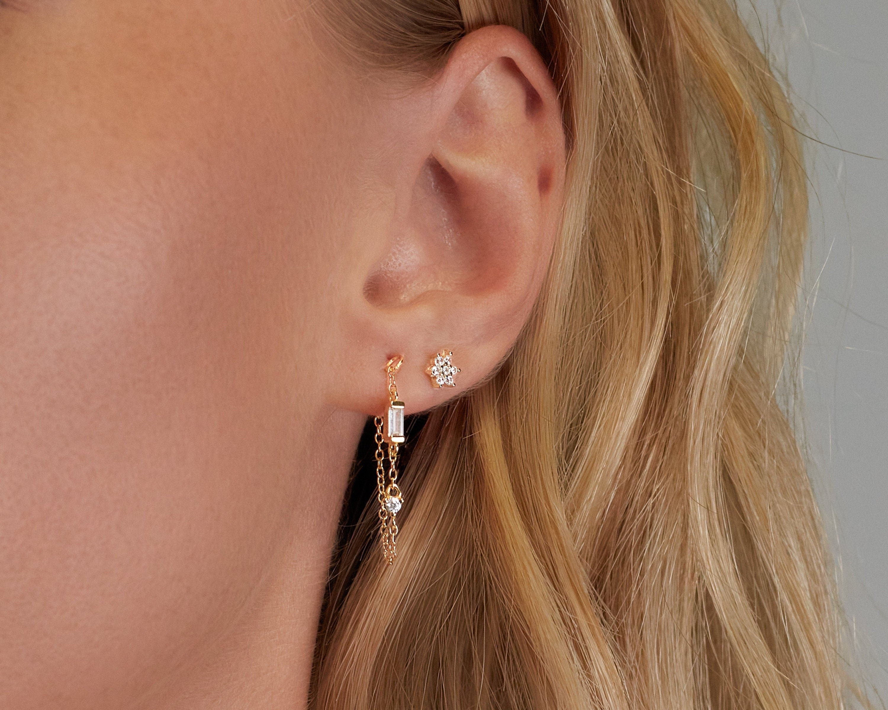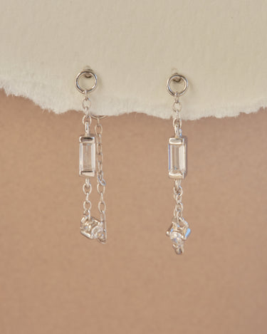 Orecchini a lobo con catenella e pendenti di zirconi baguette e rotondi, che donano movimento e luminosità ad ogni gesto. Un design raffinato e moderno, ideale per chi cerca un dettaglio elegante ma leggero.