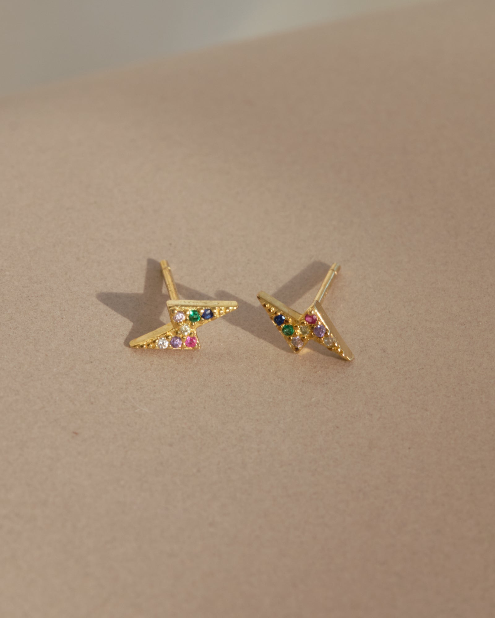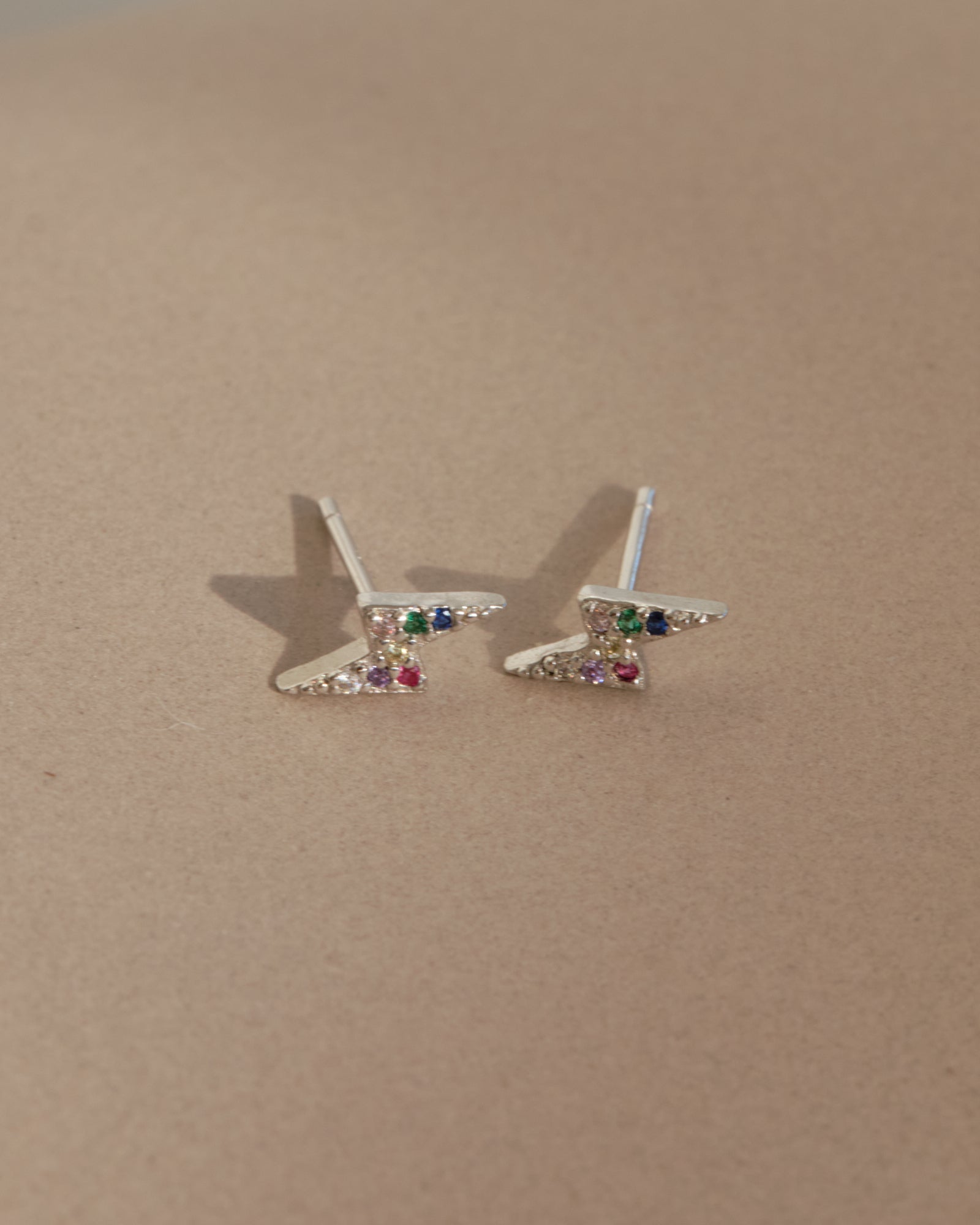 Orecchini piccoli a forma di fulmine in argento 925 con placcatura in oro 18K o rodio, decorati con zirconi multicolor taglio brillante. Un modello compatto e luminoso, ideale per chi cerca un tocco di colore e stile in versione minimal.
