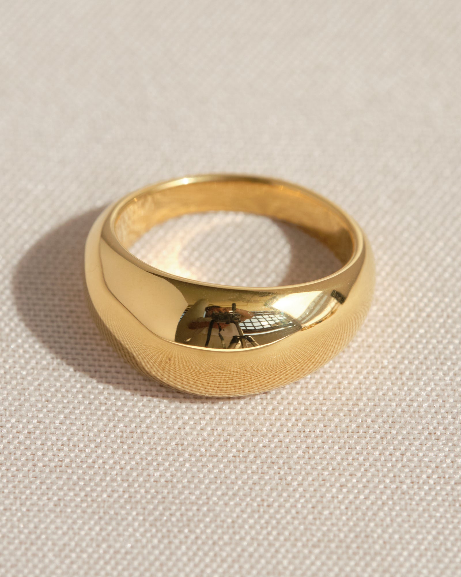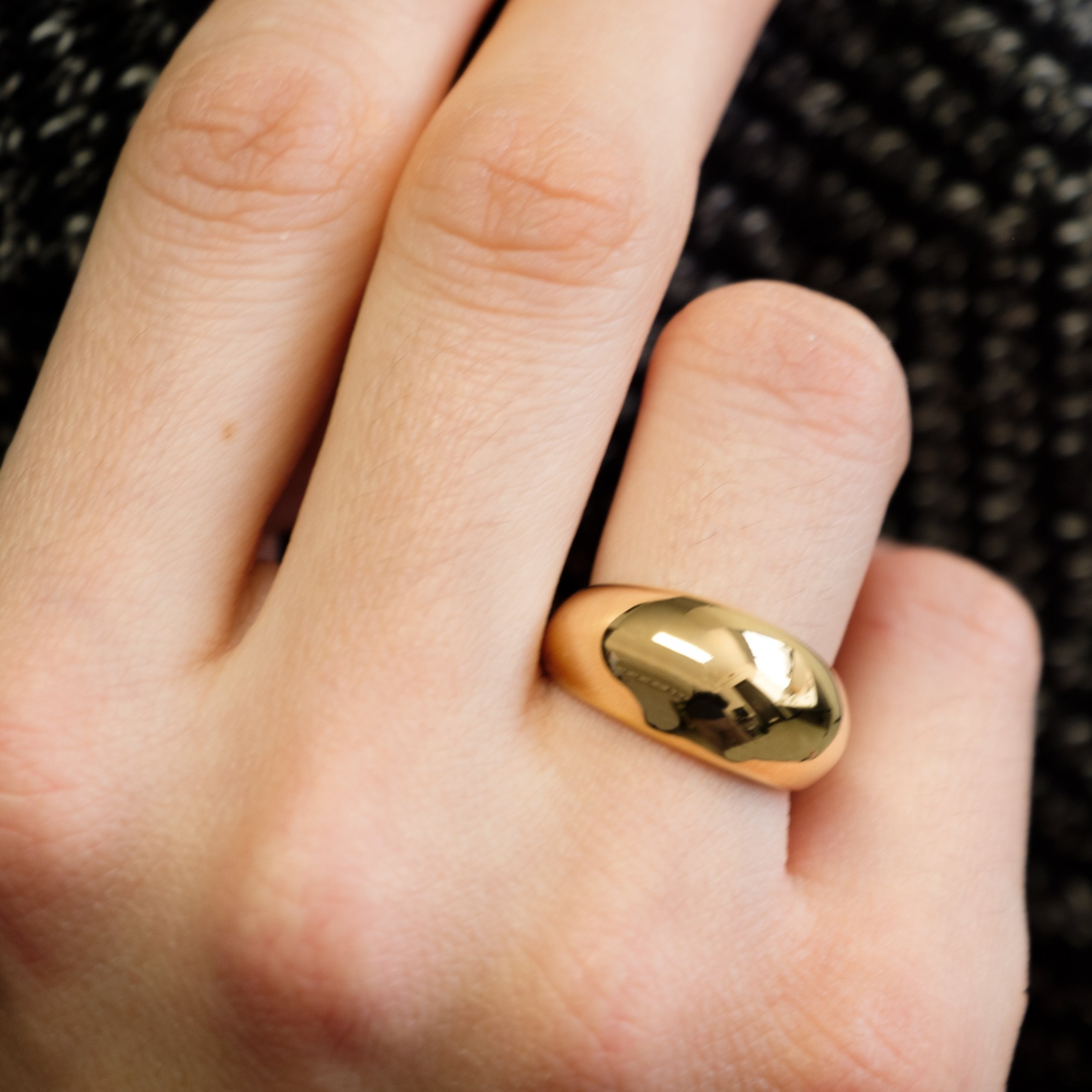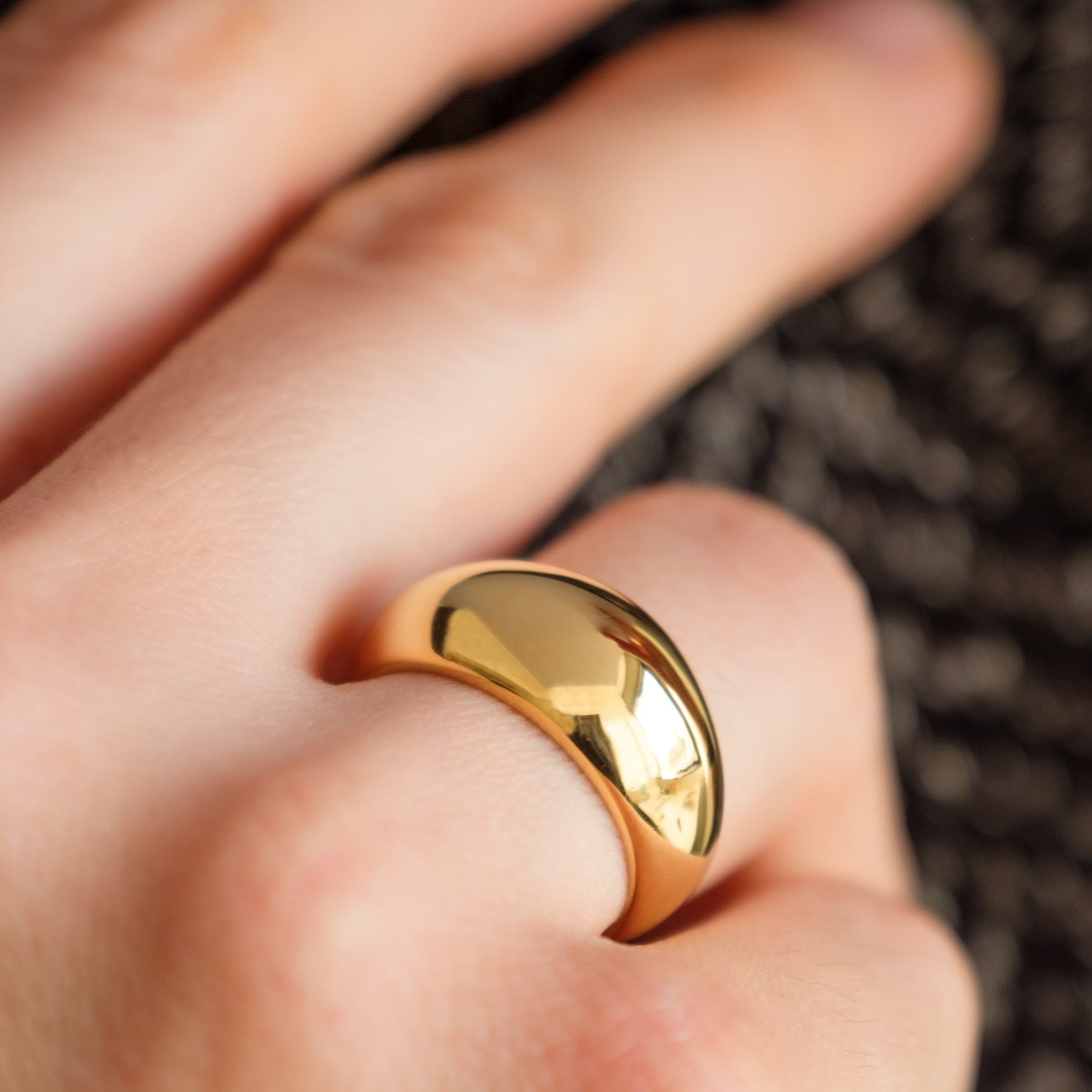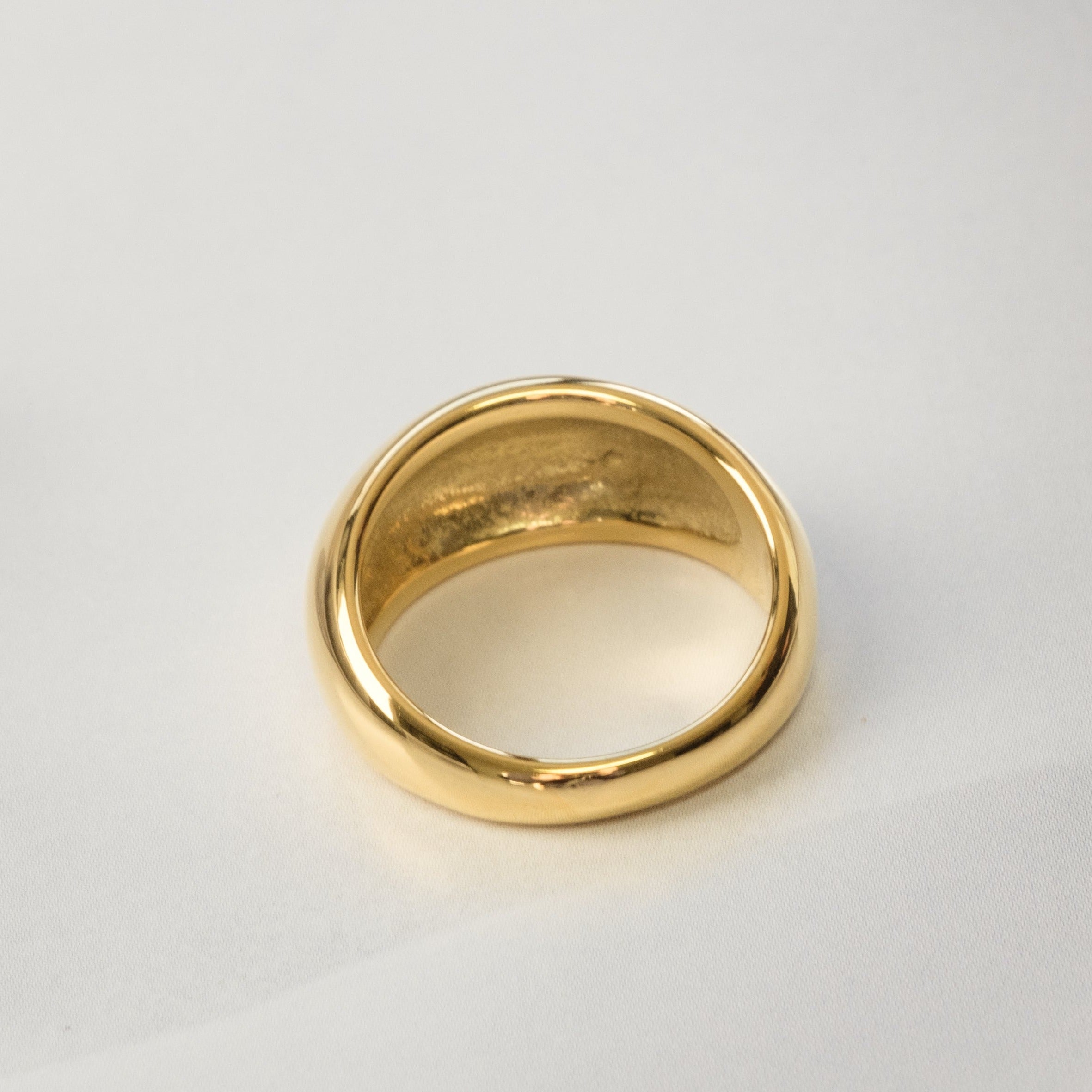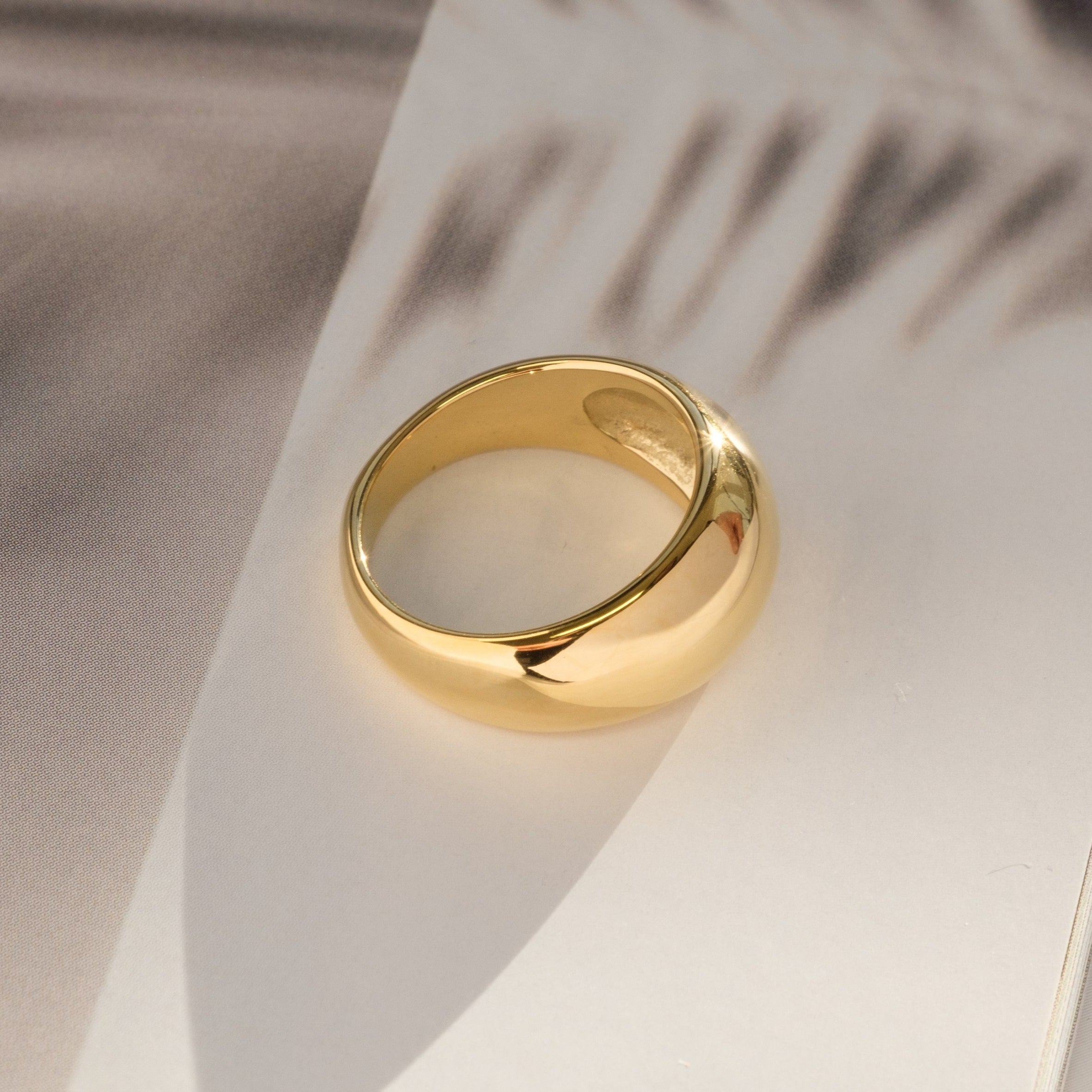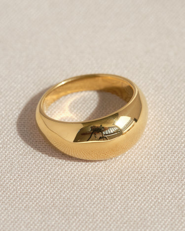 Il design deciso di questo anello bombato in acciaio inossidabile placcato oro dona carattere e luminosità a ogni look, con linee morbide e un profilo audace.