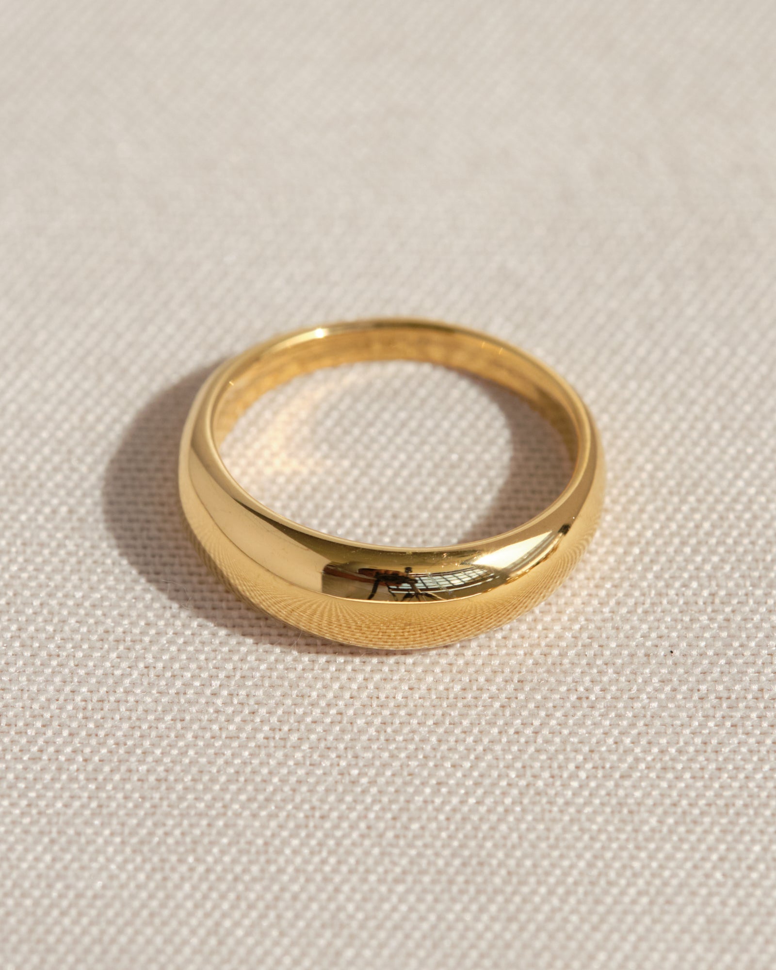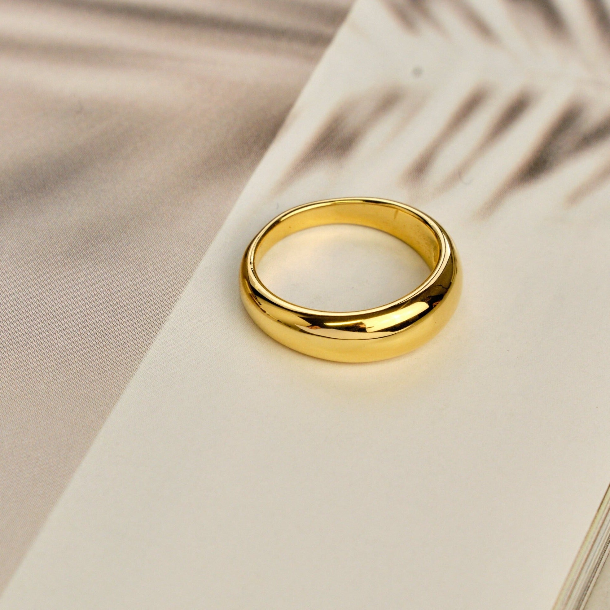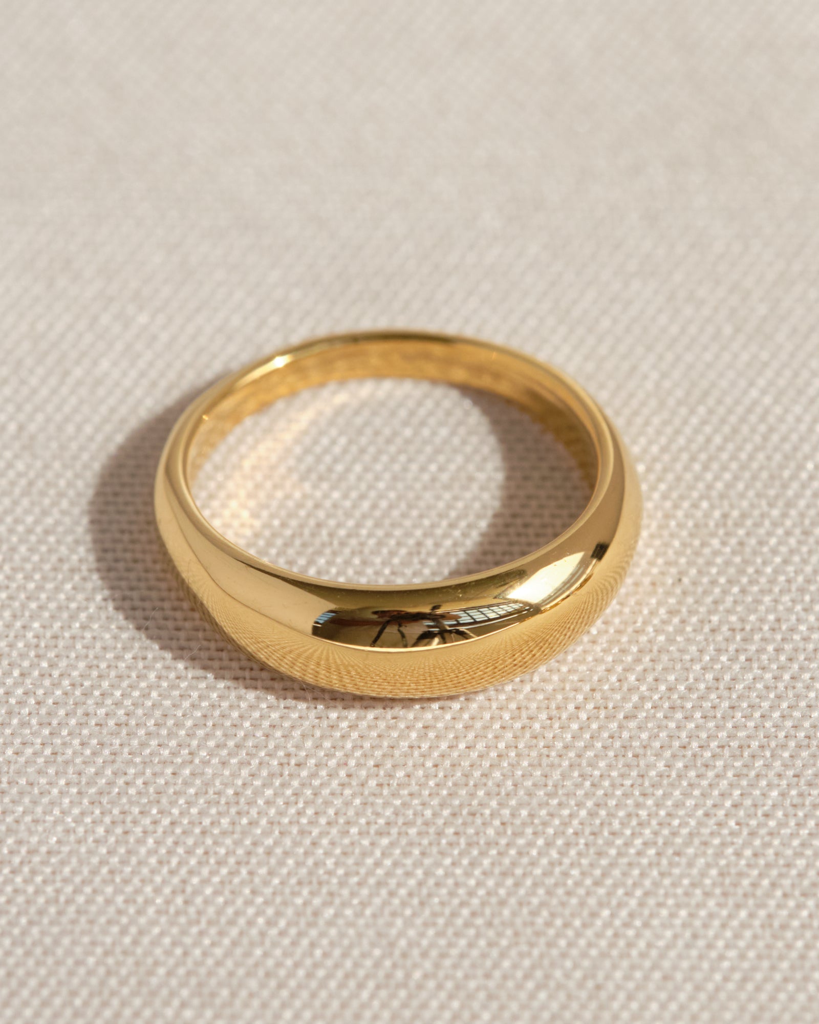 Un classico intramontabile in versione sottile. Questo anello bombato in acciaio inossidabile placcato oro unisce raffinatezza e versatilità, perfetto da indossare da solo o abbinato ad altri gioielli.