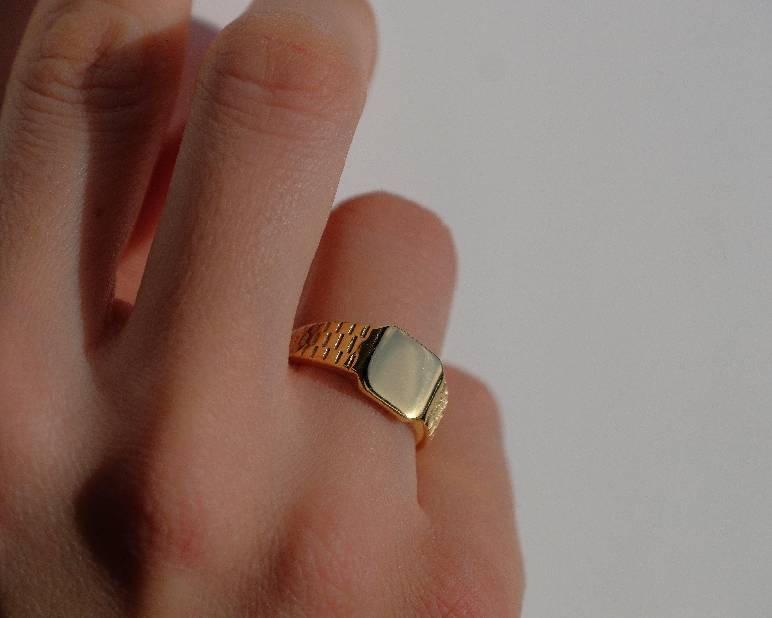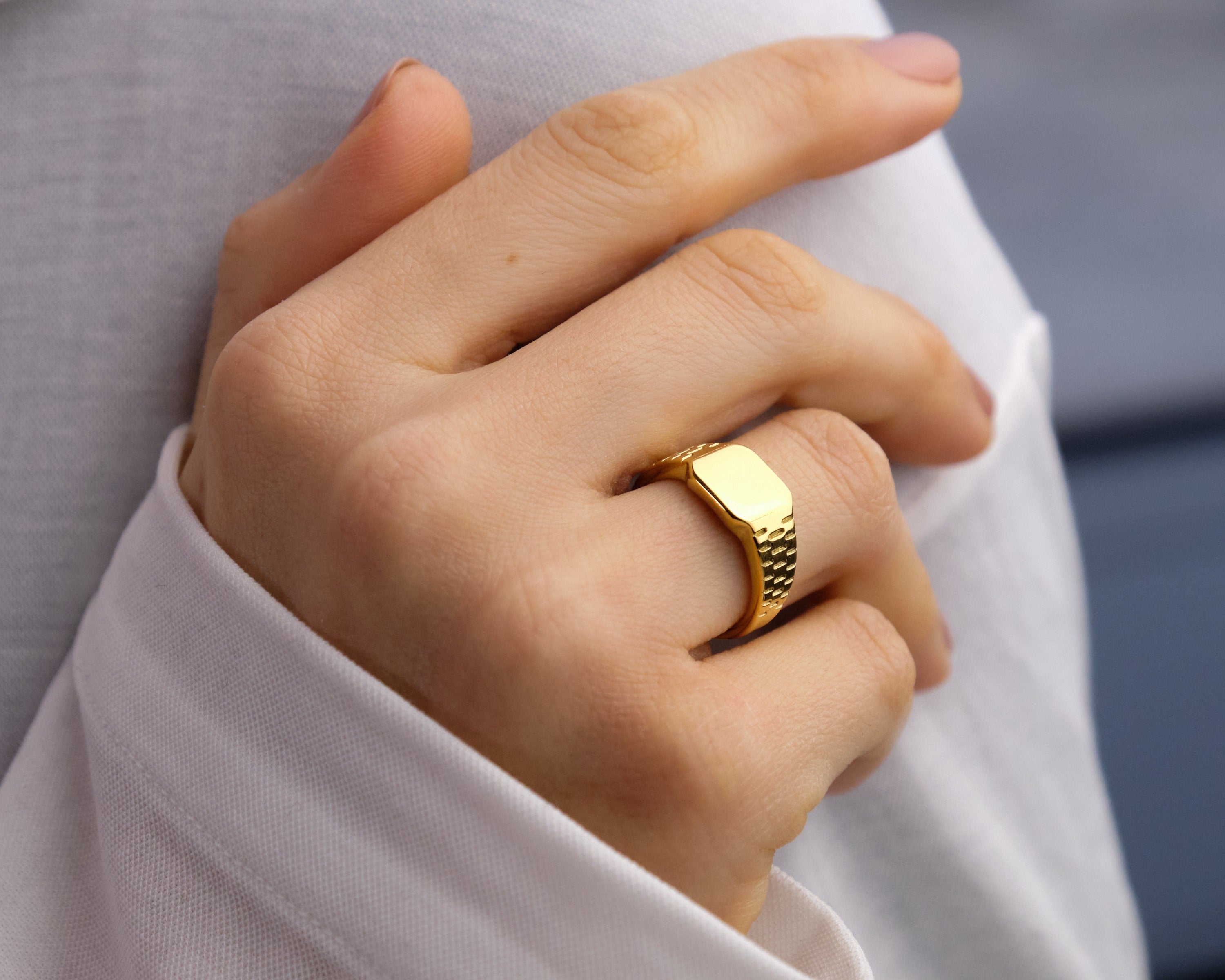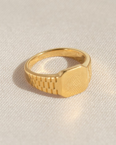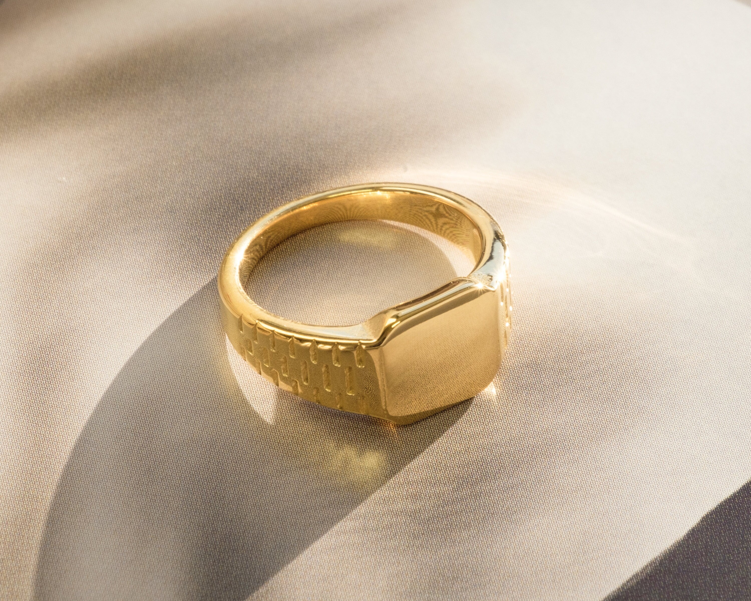 Un anello chevalier dallo stile essenziale ma deciso: il design con fasce incise dona movimento alla superficie dorata, creando riflessi eleganti e moderni. Perfetto per chi ama accessori dal carattere minimal ma distintivo.