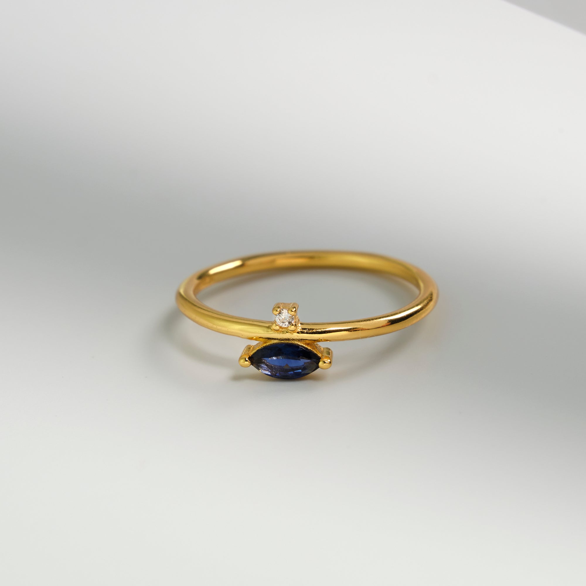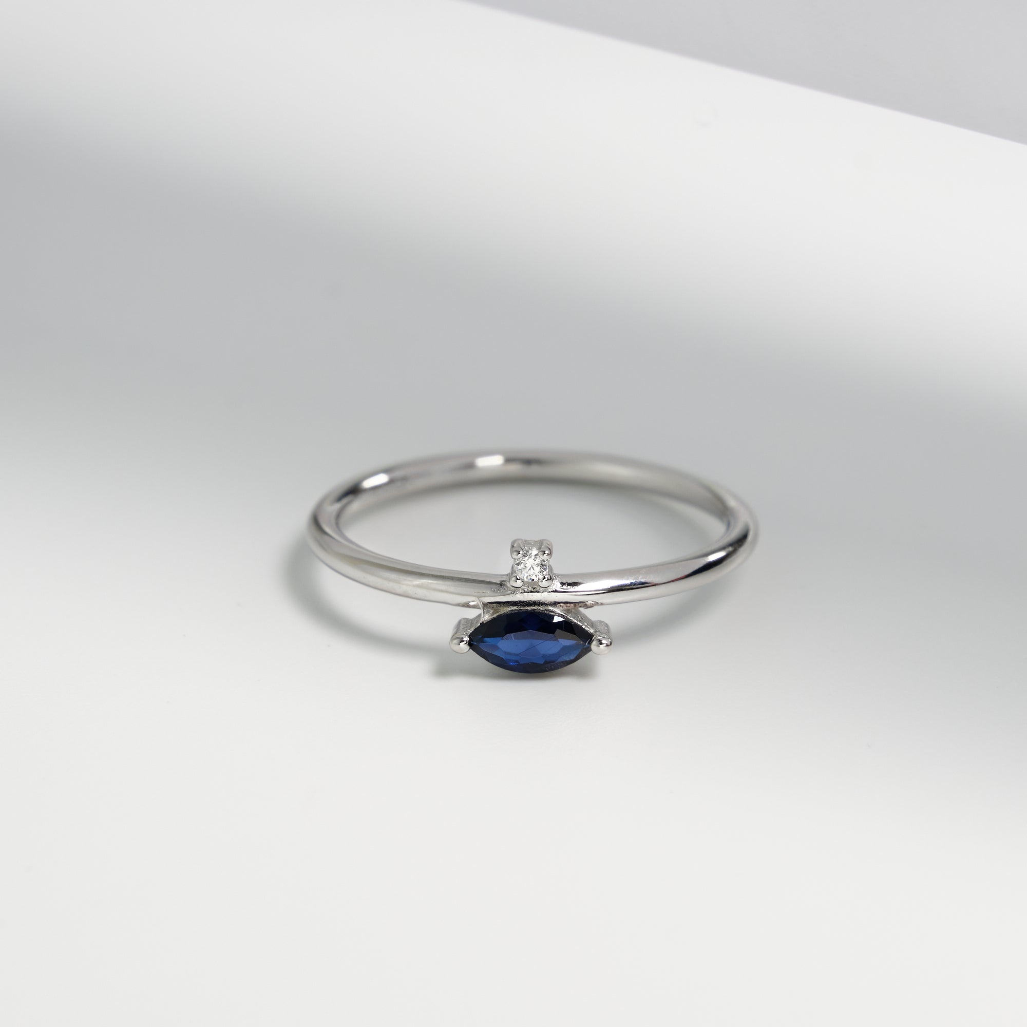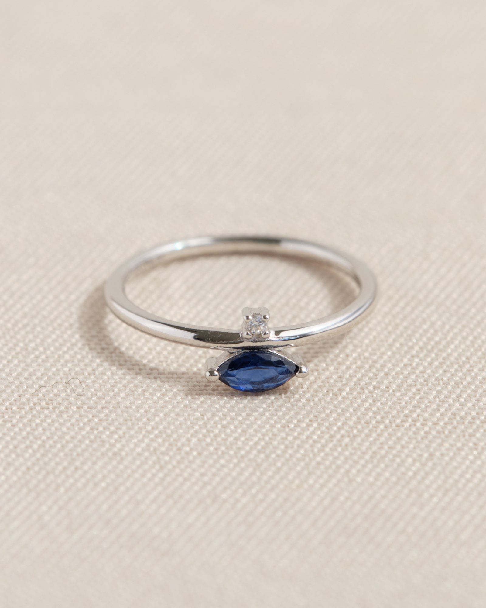 Un anello raffinato con zircone blu zaffiro taglio marquise, impreziosito da un piccolo zircone bianco che illumina la composizione. Delicato e femminile.