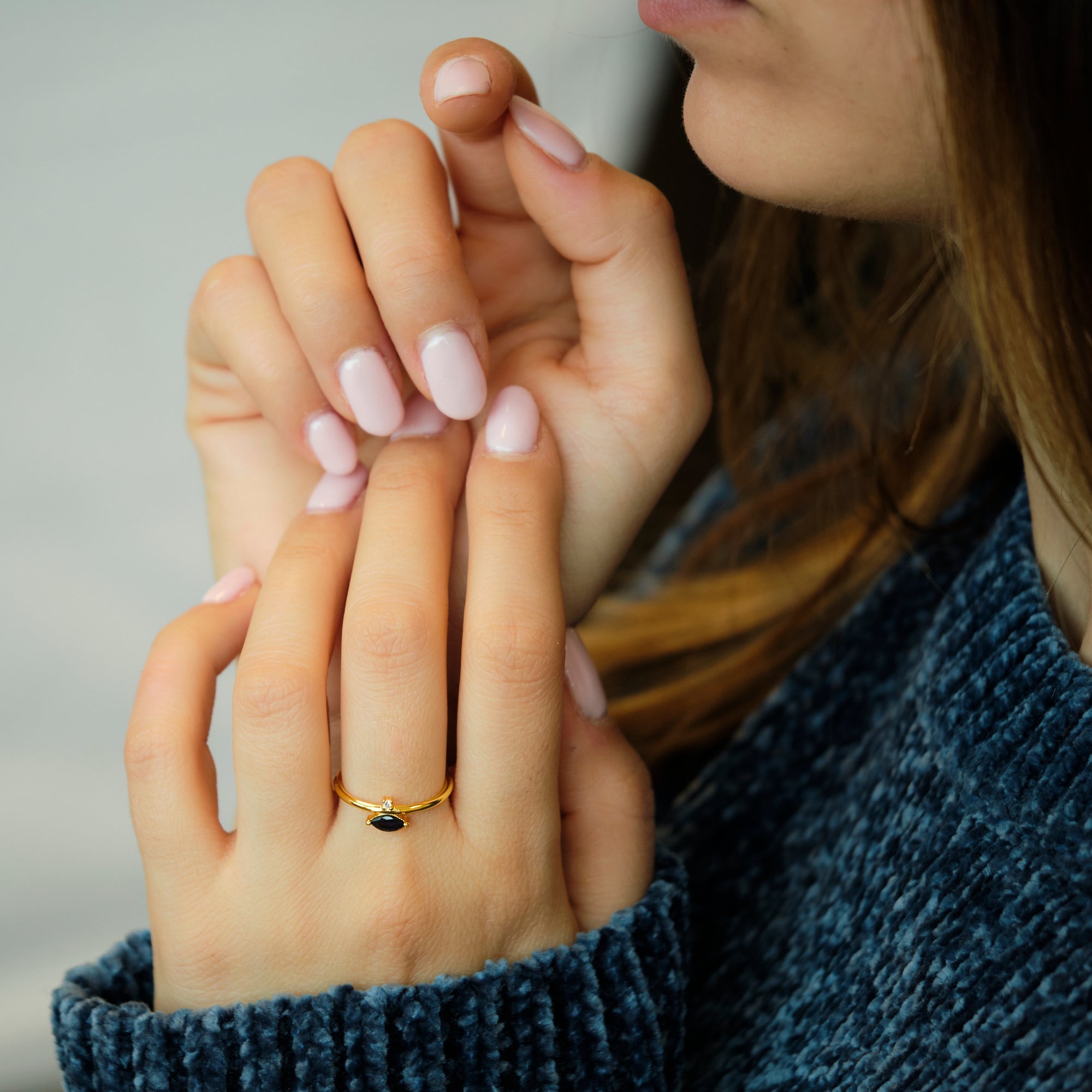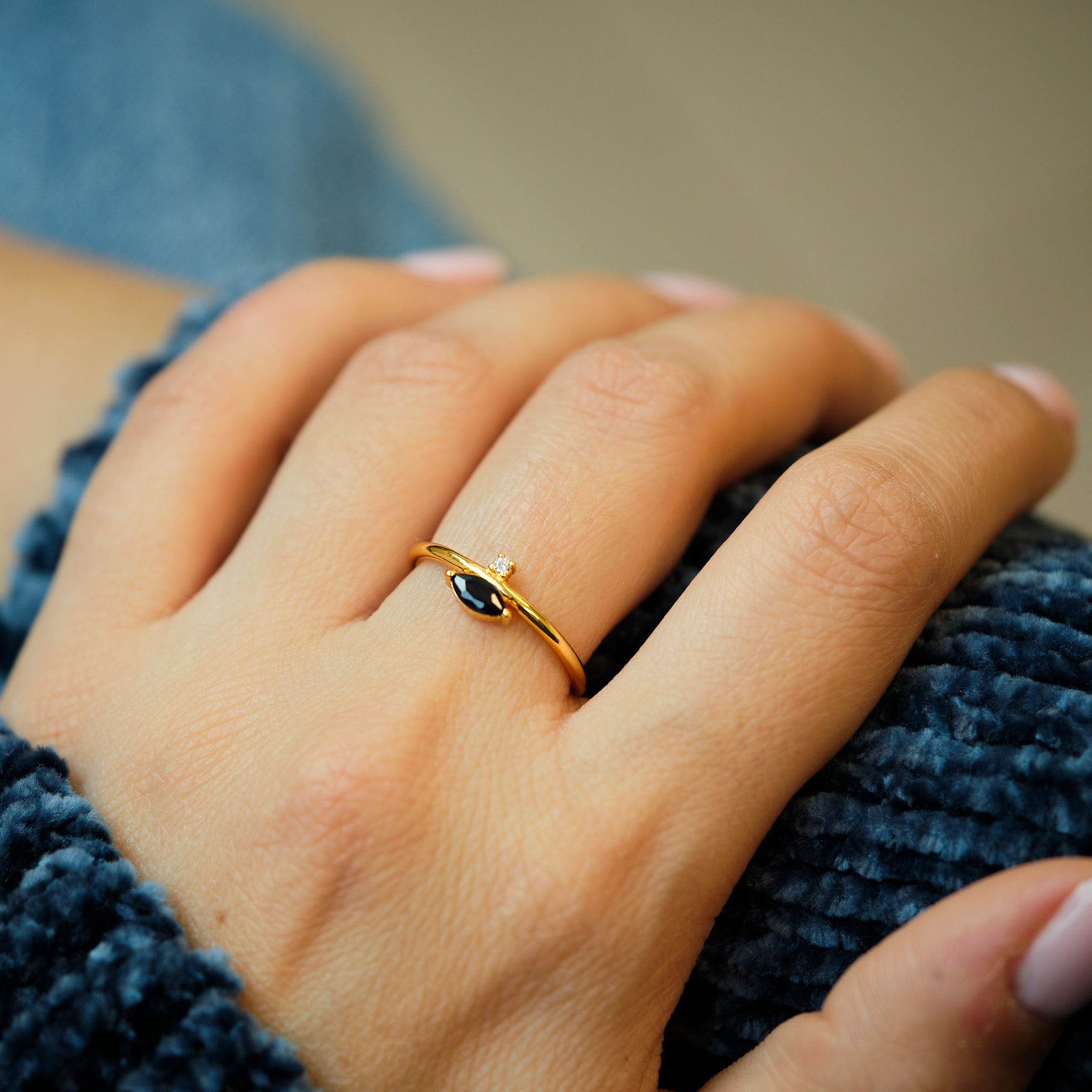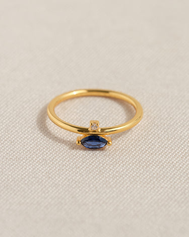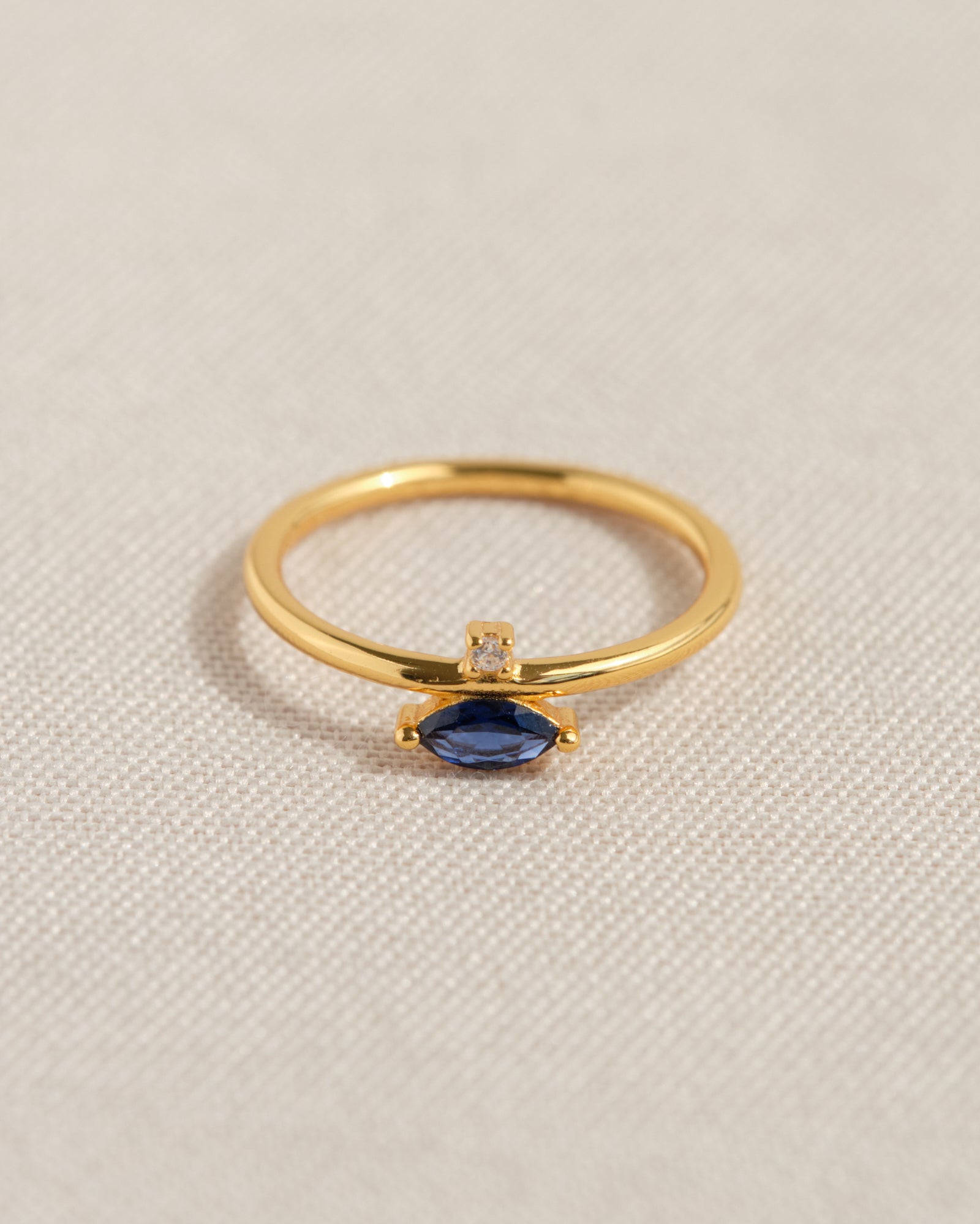 Un anello raffinato con zircone blu zaffiro taglio marquise, impreziosito da un piccolo zircone bianco che illumina la composizione. Delicato e femminile.