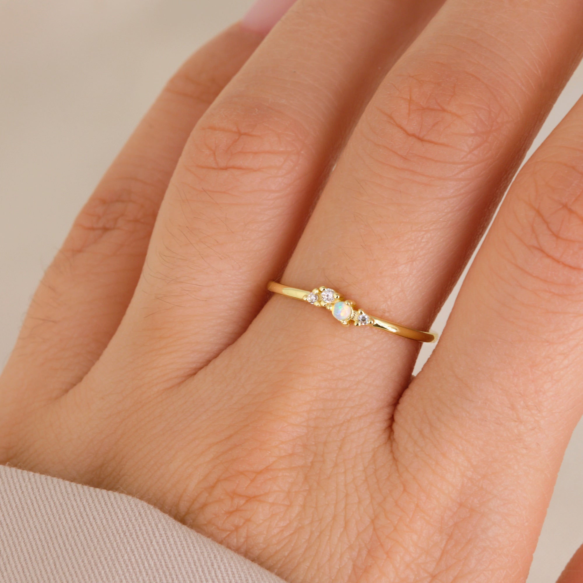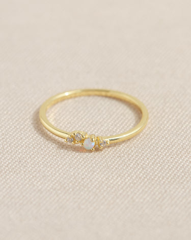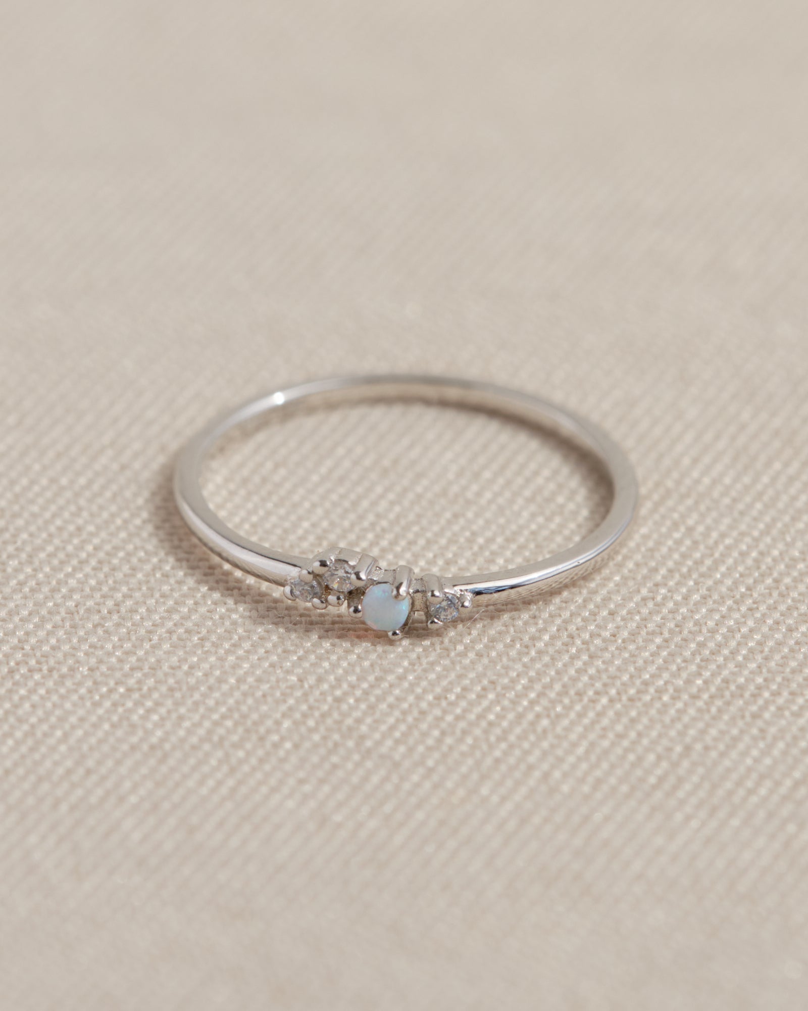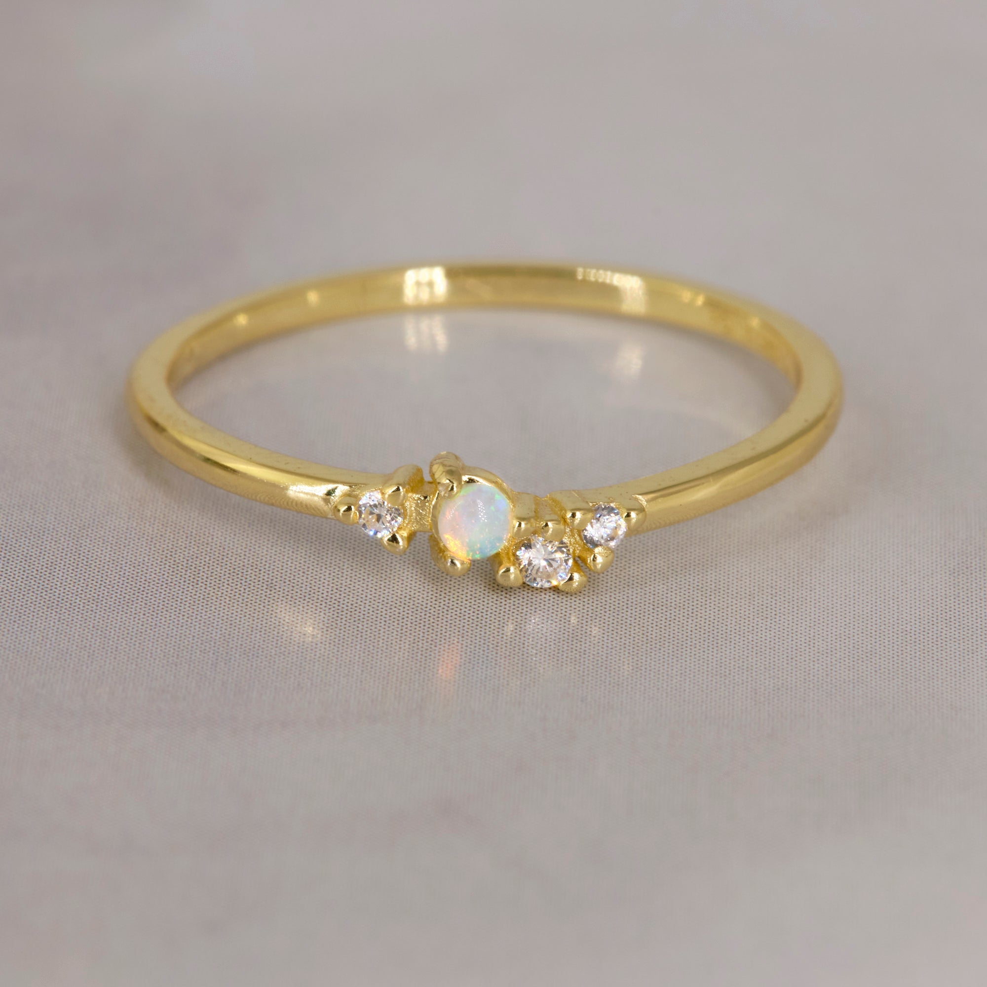 Un anello delicato e luminoso, con piccolo opale centrale affiancato da zirconi bianchi che donano luce e raffinatezza. Perfetto per chi ama lo stile sottile e femminile.