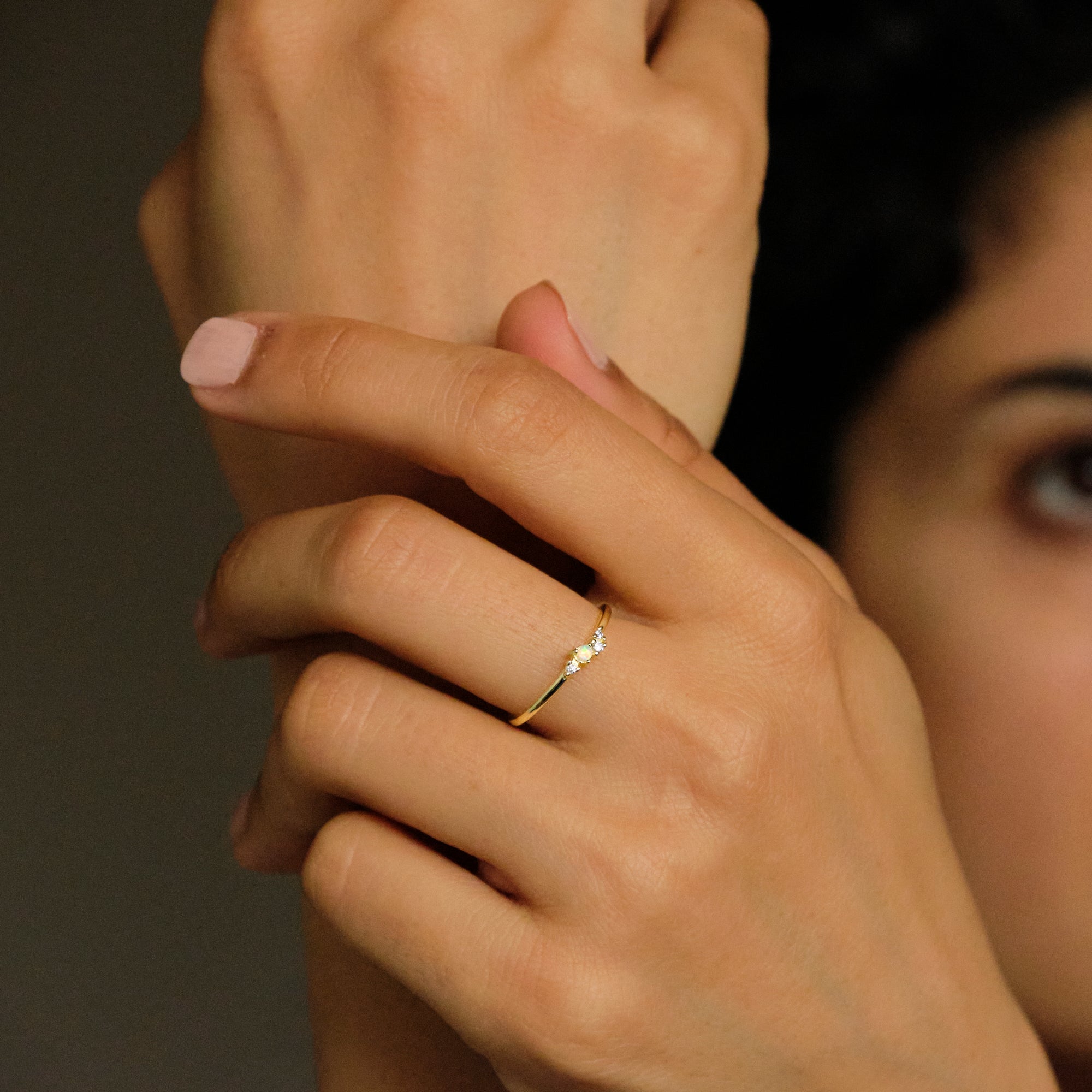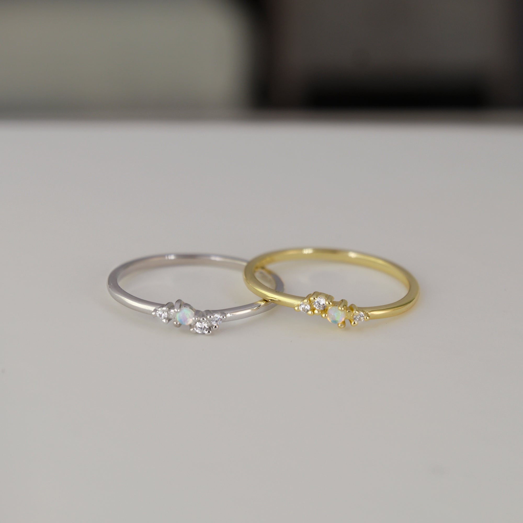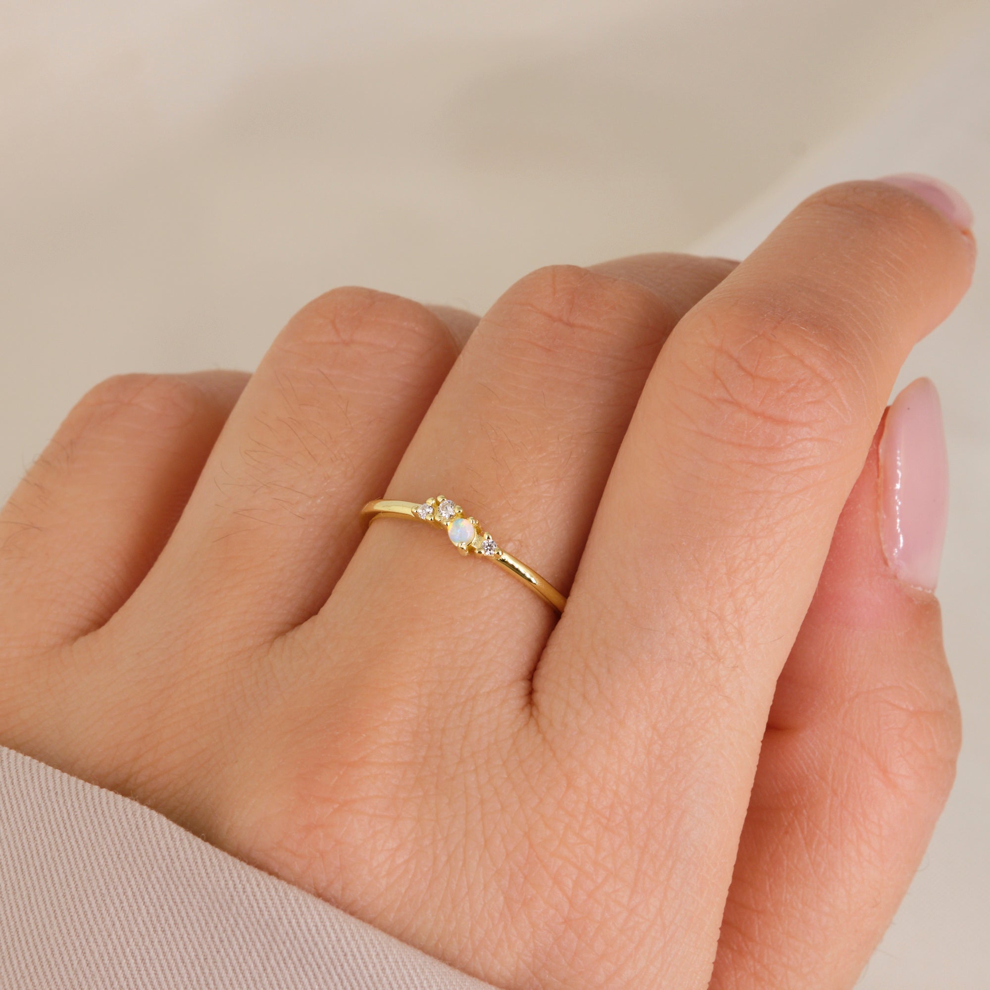 Un anello delicato e luminoso, con piccolo opale centrale affiancato da zirconi bianchi che donano luce e raffinatezza. Perfetto per chi ama lo stile sottile e femminile.
