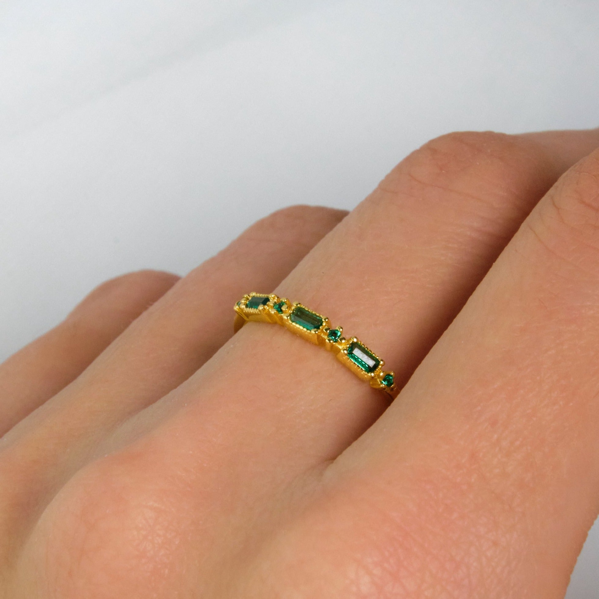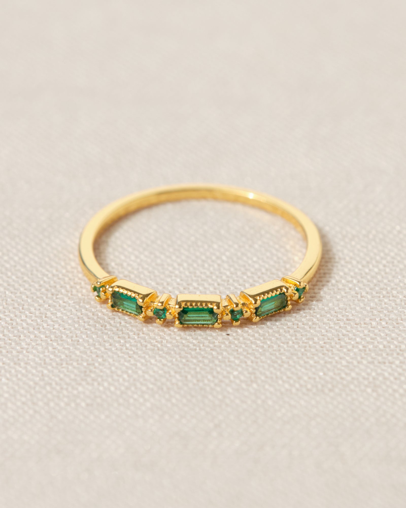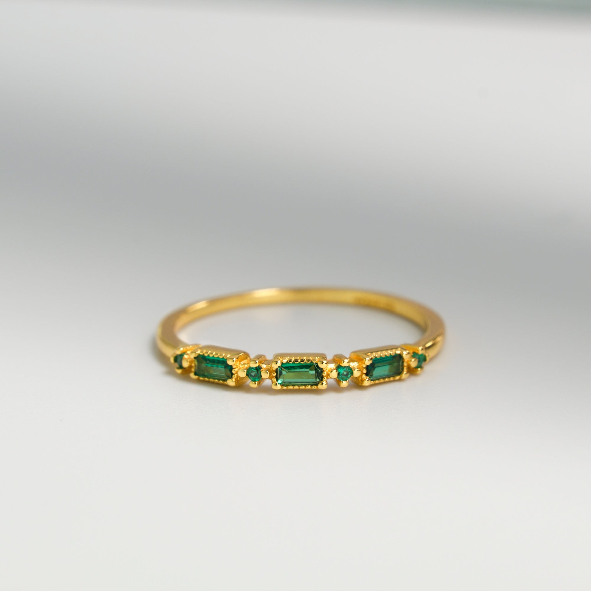 Un design delicato con tre zirconi verdi smeraldo taglio rettangolare, esaltati da piccoli dettagli luminosi. Un anello sottile ma d’impatto.