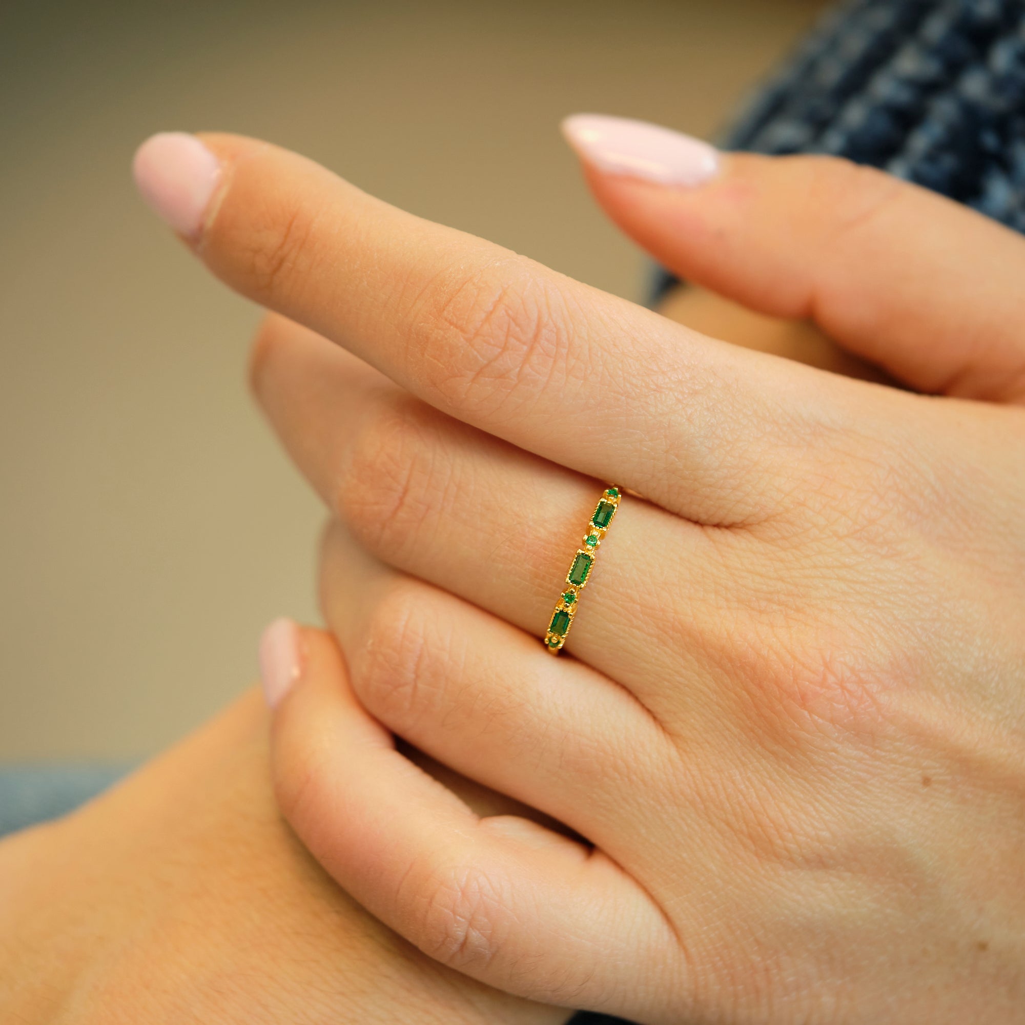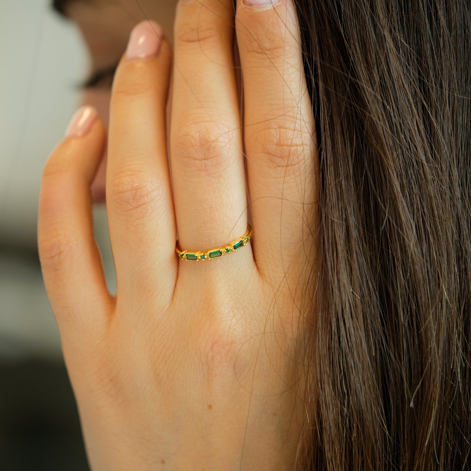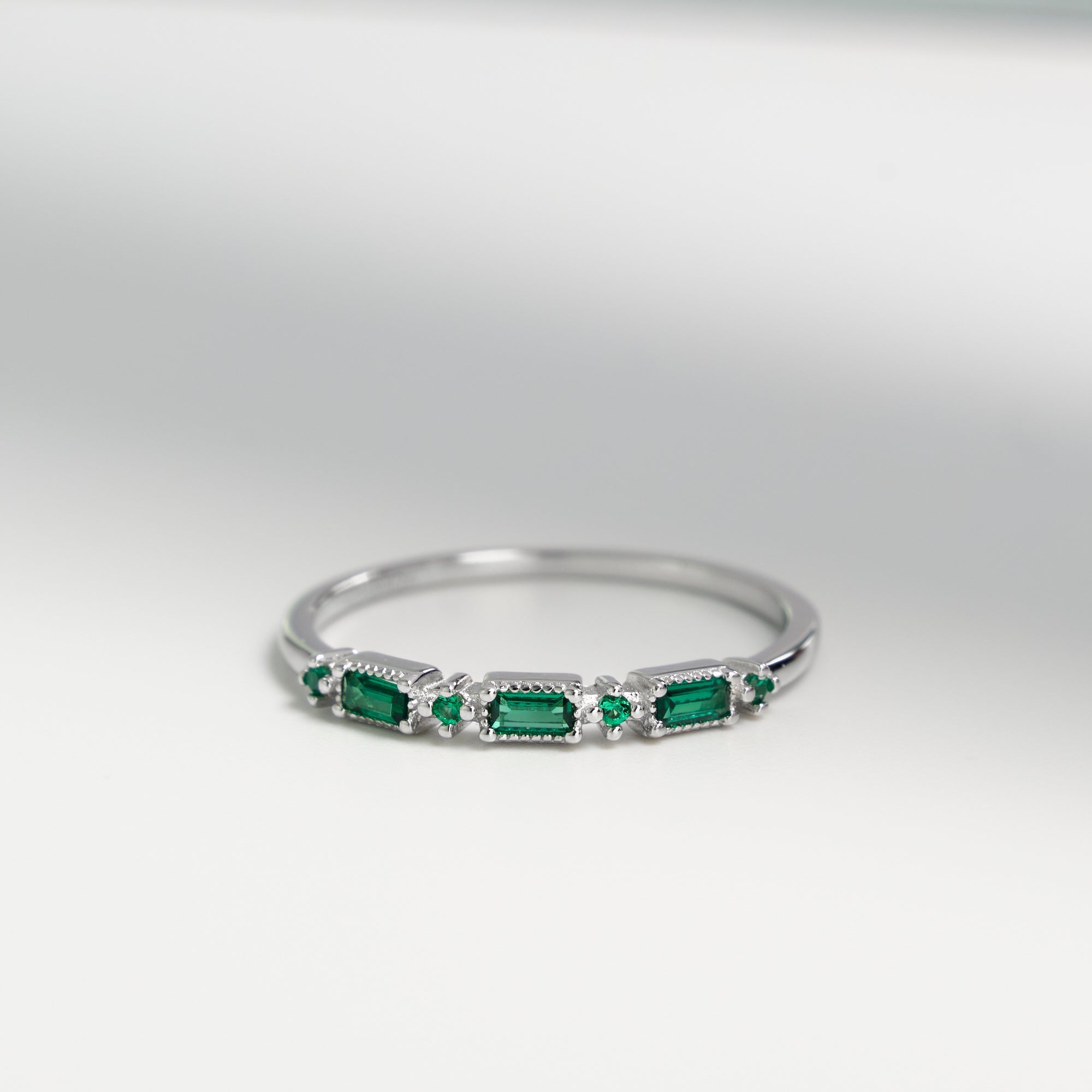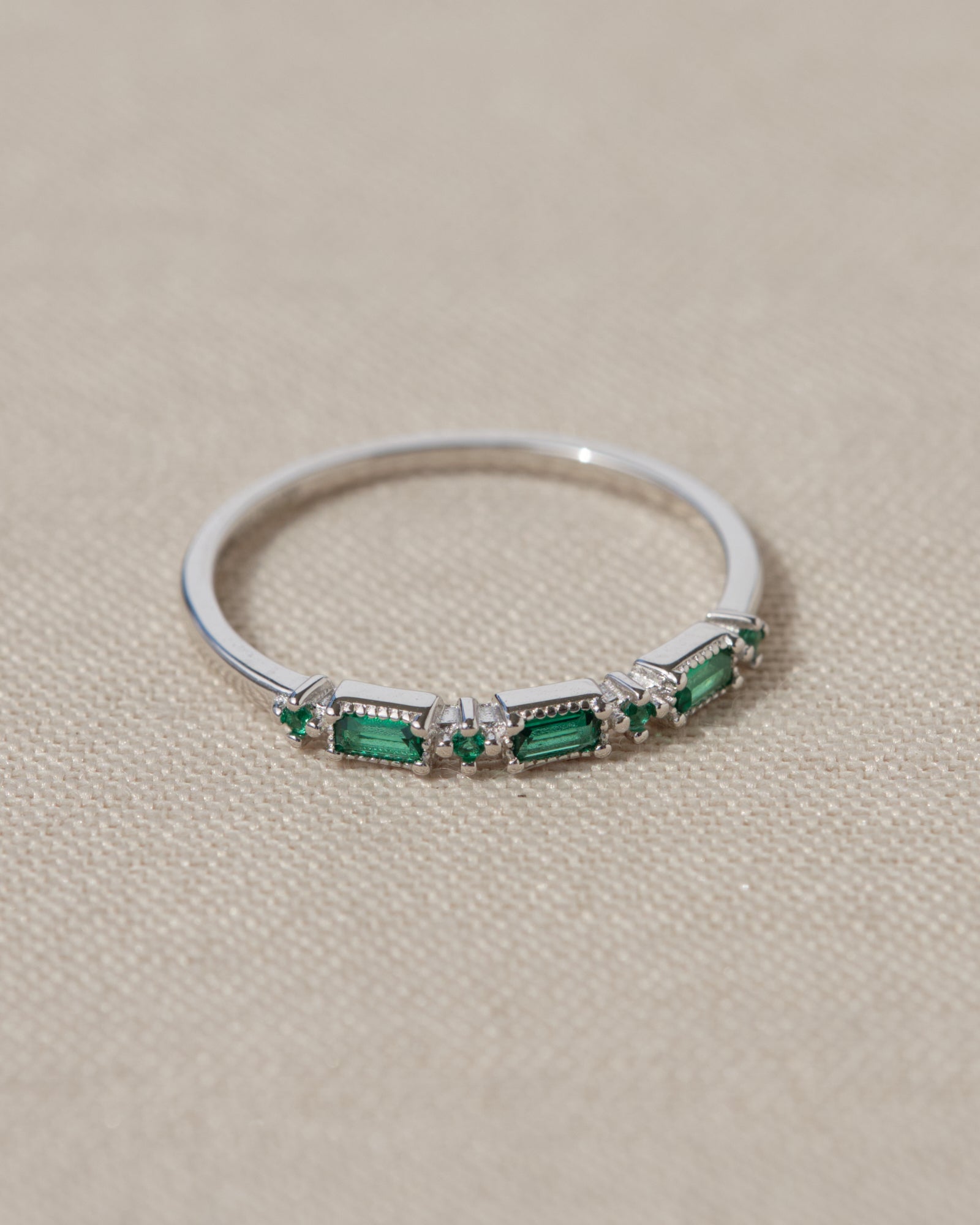 Un design delicato con tre zirconi verdi smeraldo taglio rettangolare, esaltati da piccoli dettagli luminosi. Un anello sottile ma d’impatto.