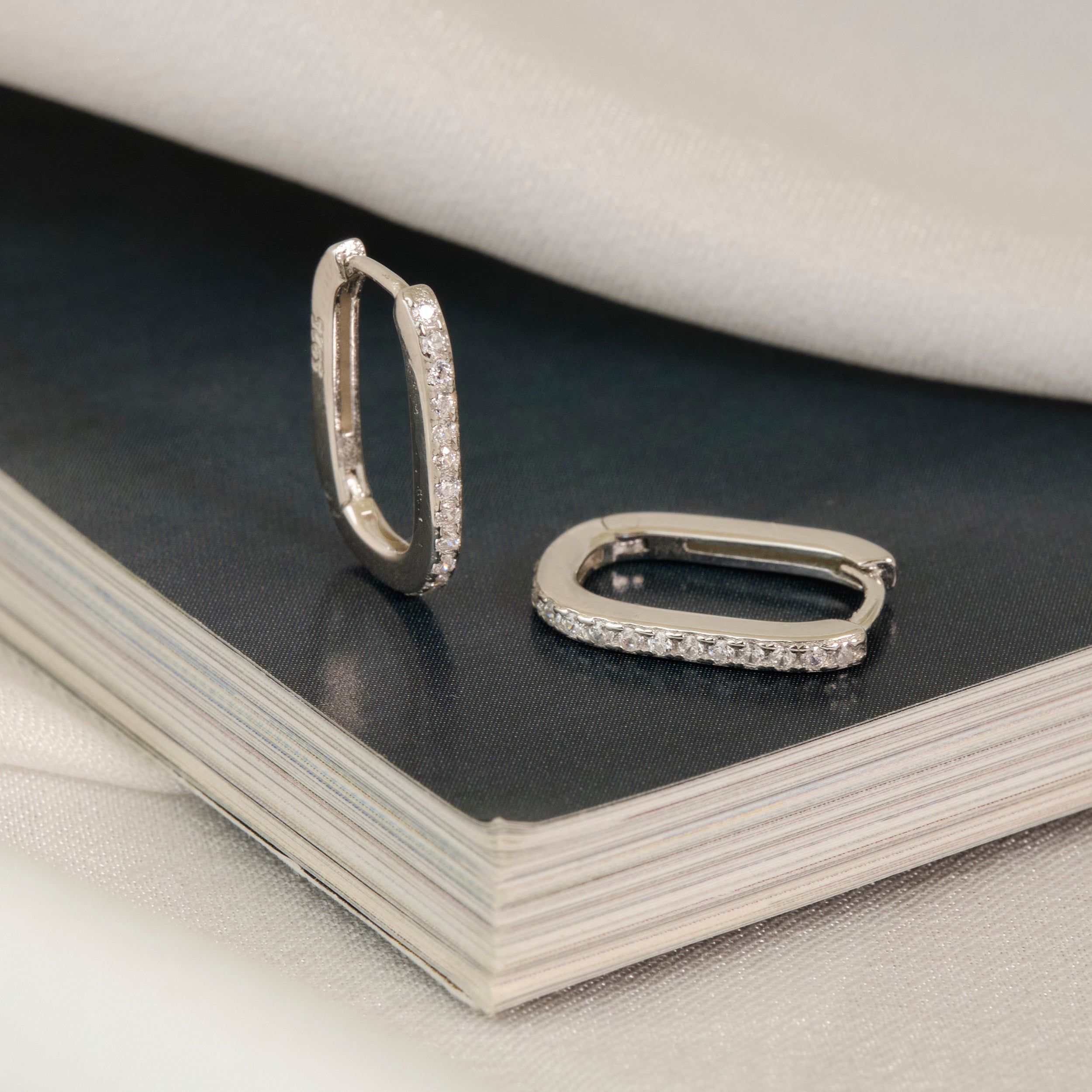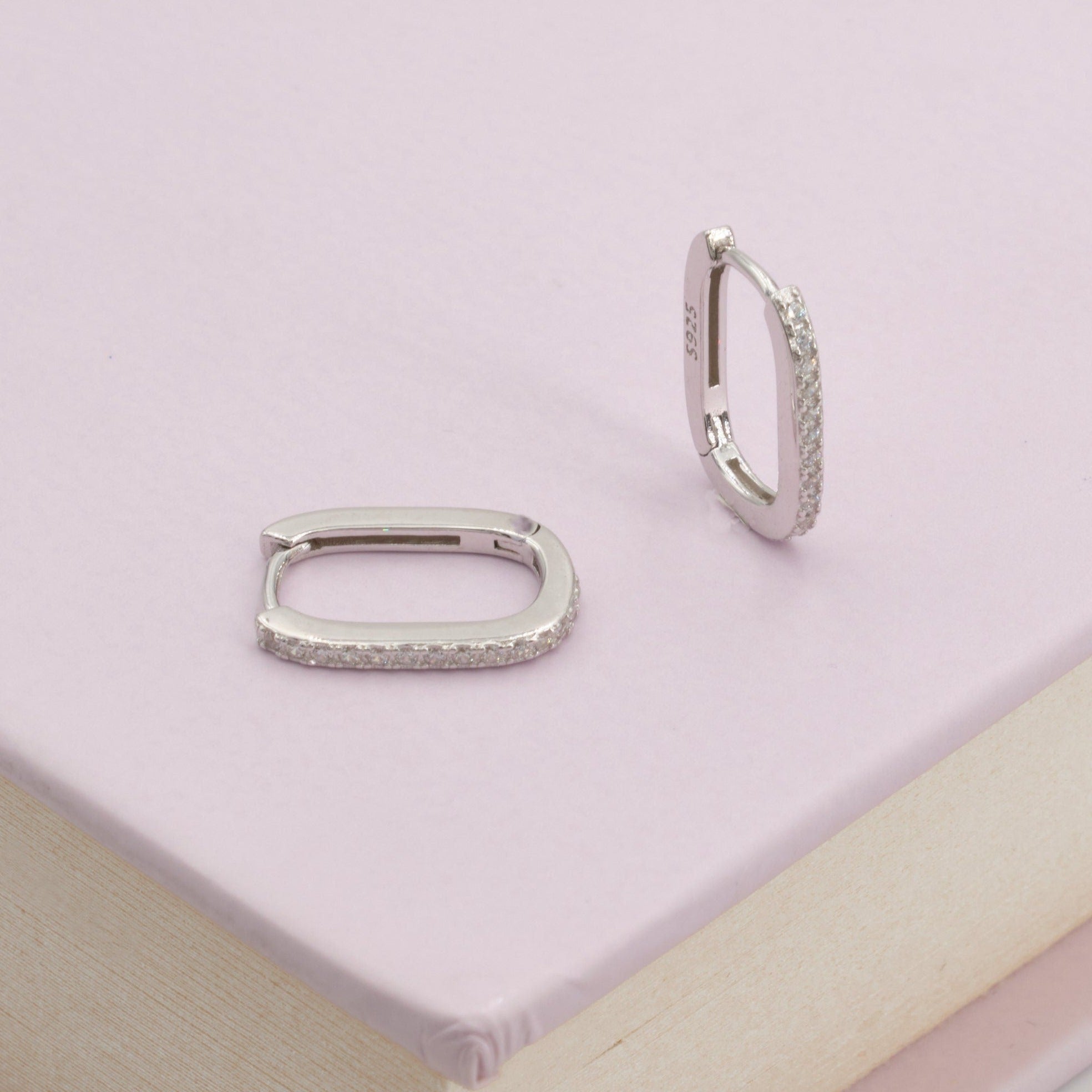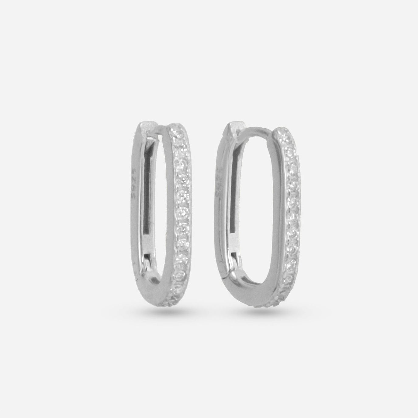 Orecchini rettangolari in argento 925 impreziositi da pavé di zirconi bianchi, dal design moderno e luminoso. La forma geometrica dona un tocco sofisticato, ideale per arricchire con eleganza sia i look quotidiani che le occasioni speciali.