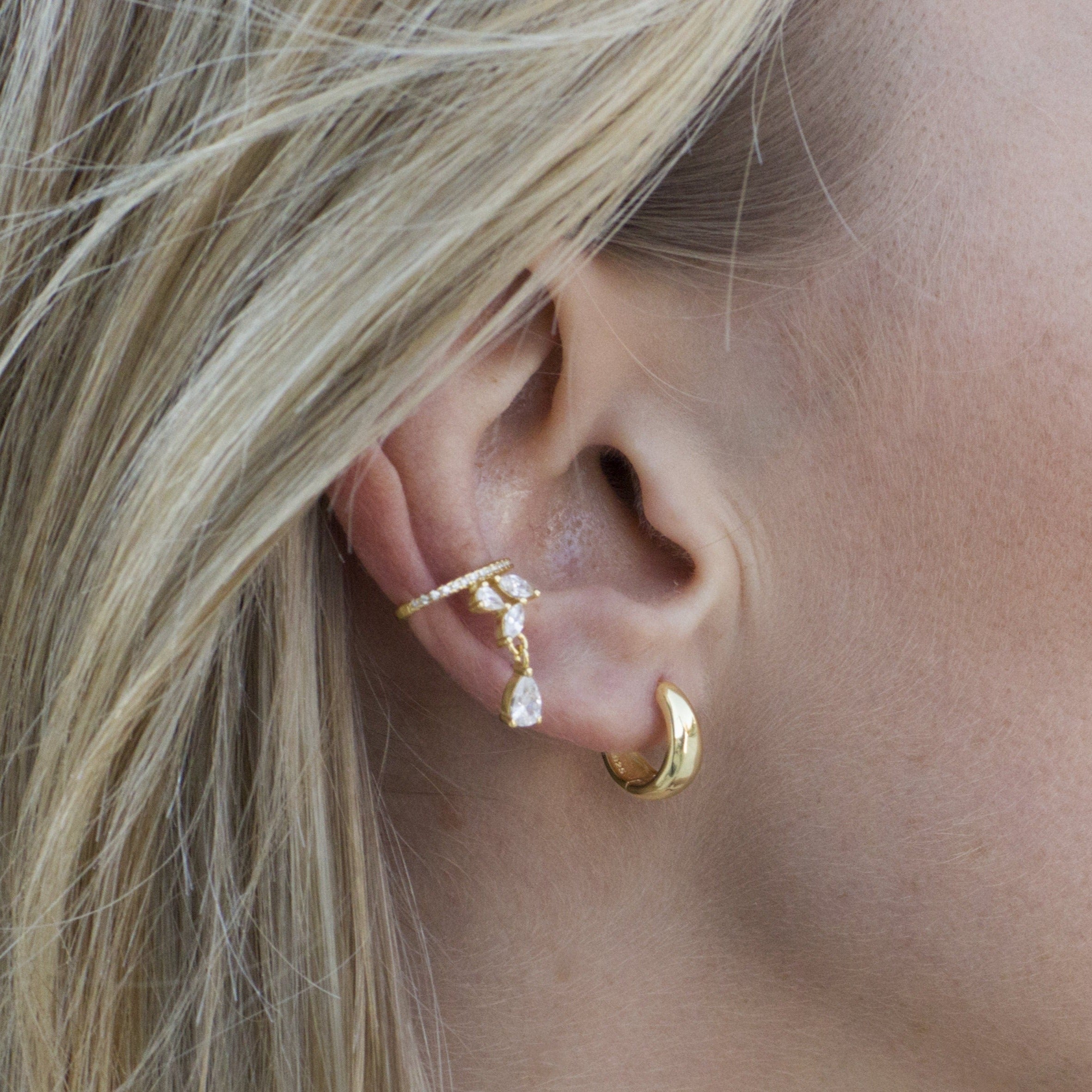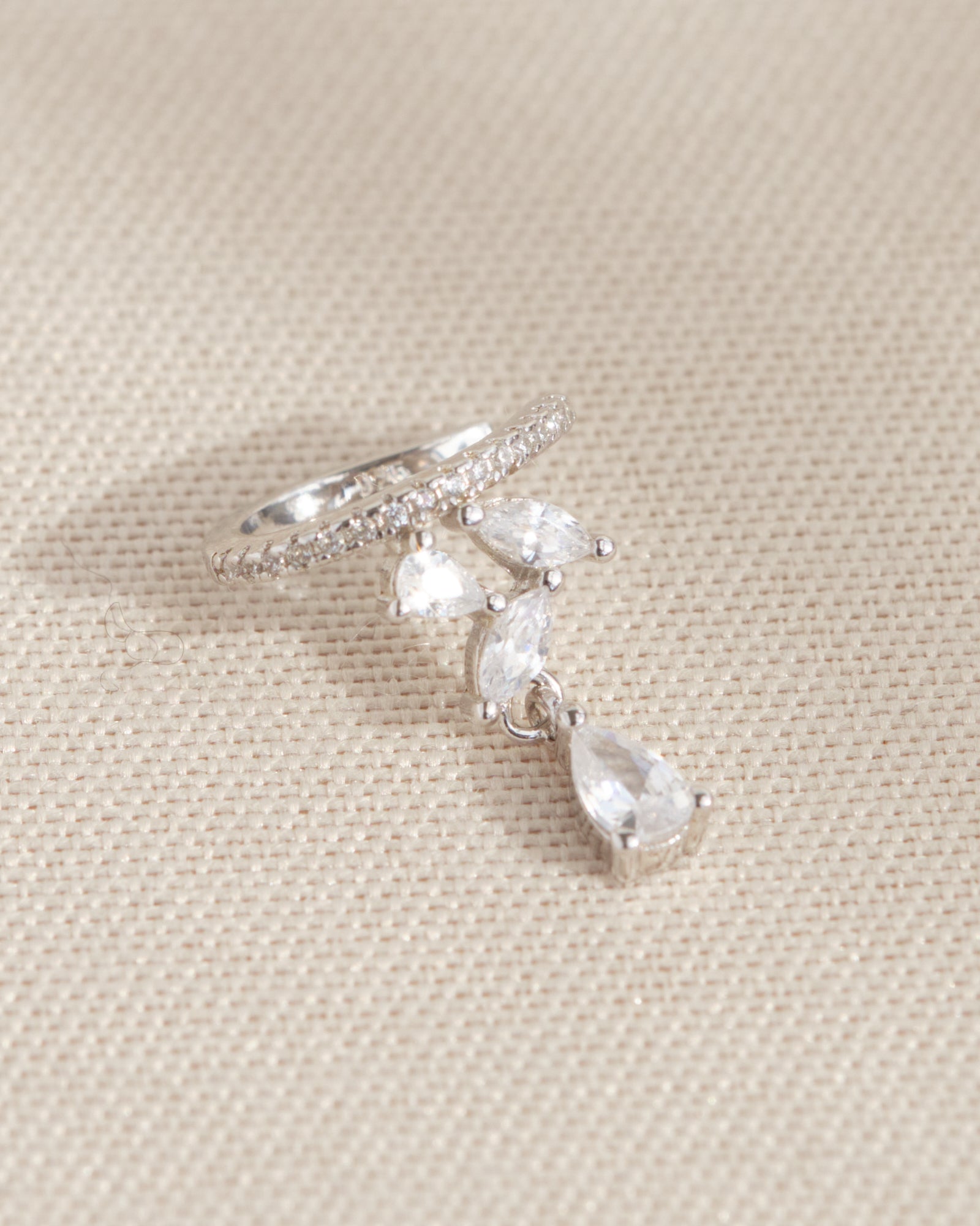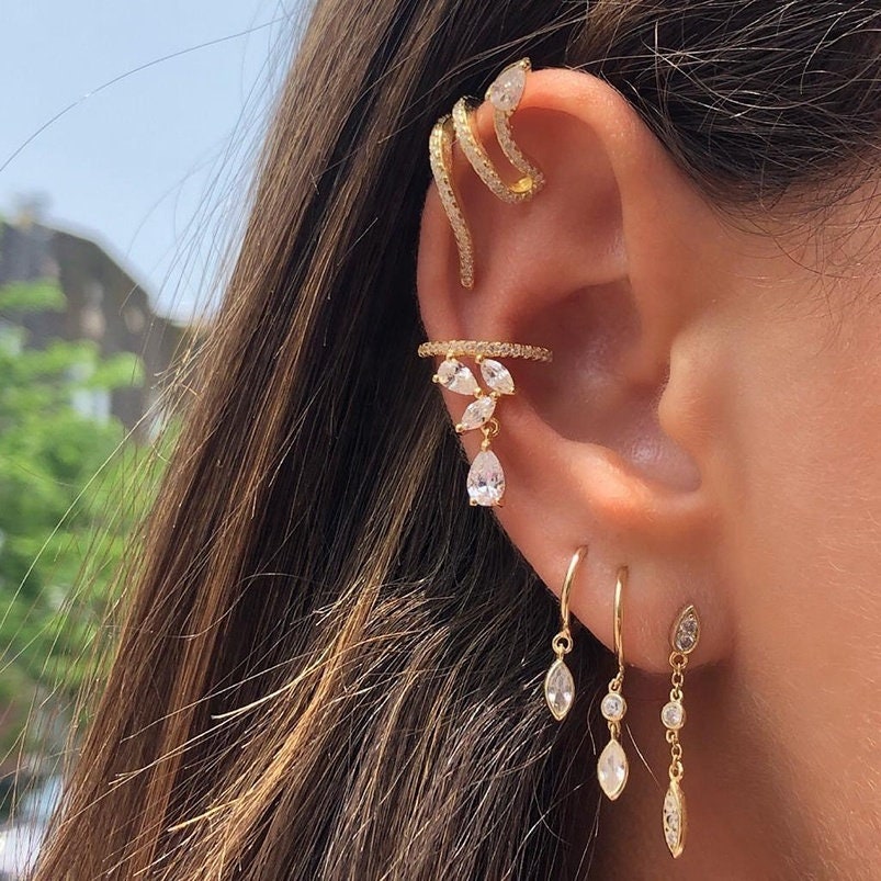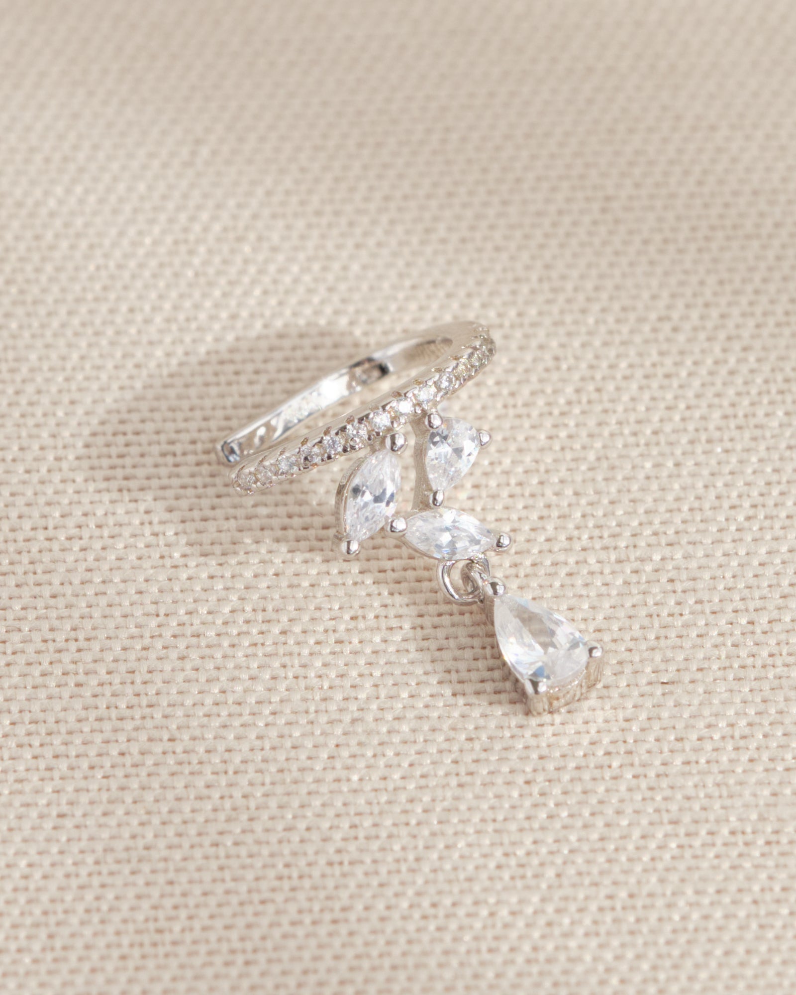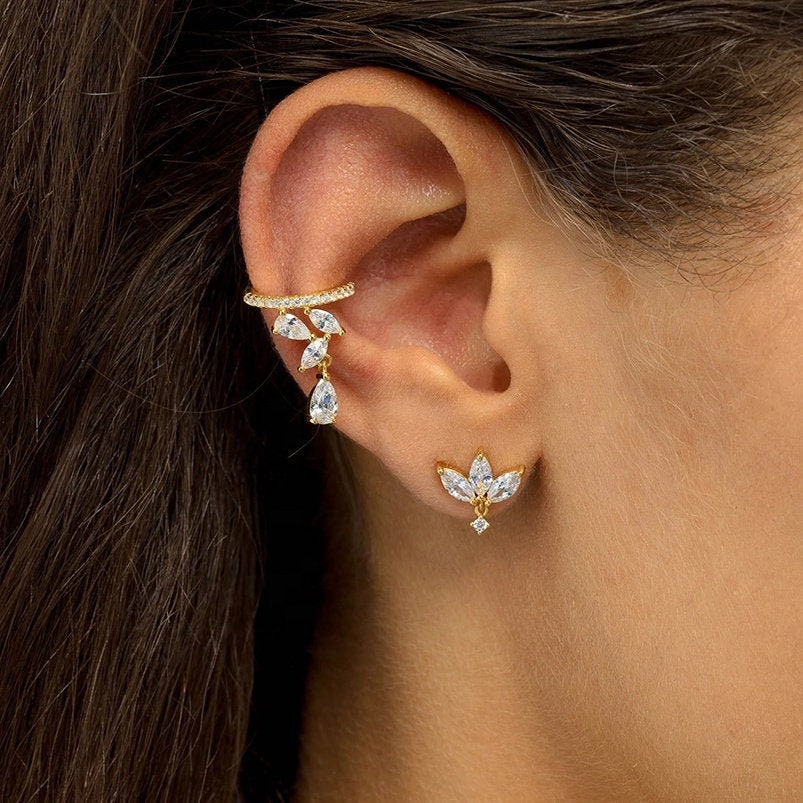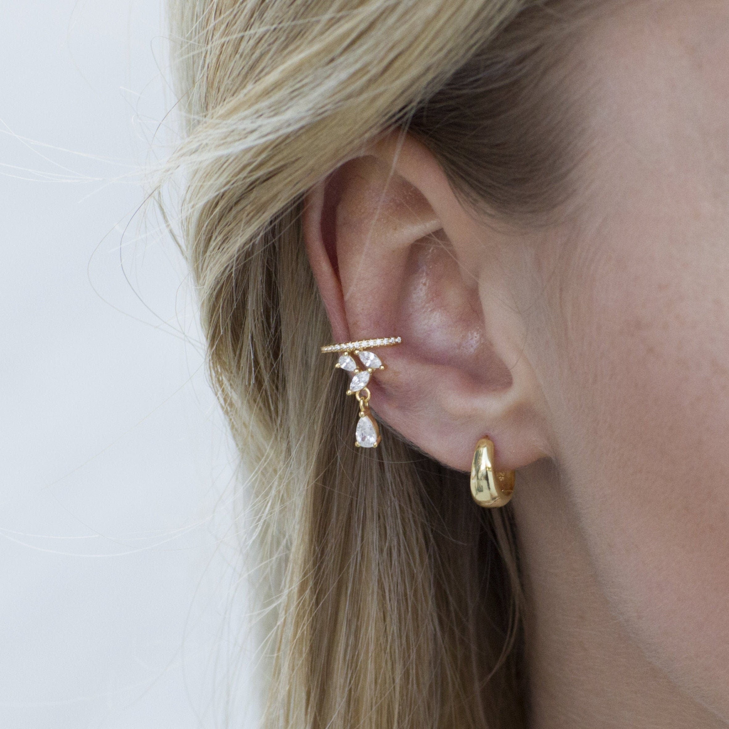 Un ear cuff elegante e luminoso, decorato con zirconi taglio goccia che seguono armoniosamente il profilo dell’orecchio. Raffinato e versatile, perfetto per completare look sia quotidiani che speciali.