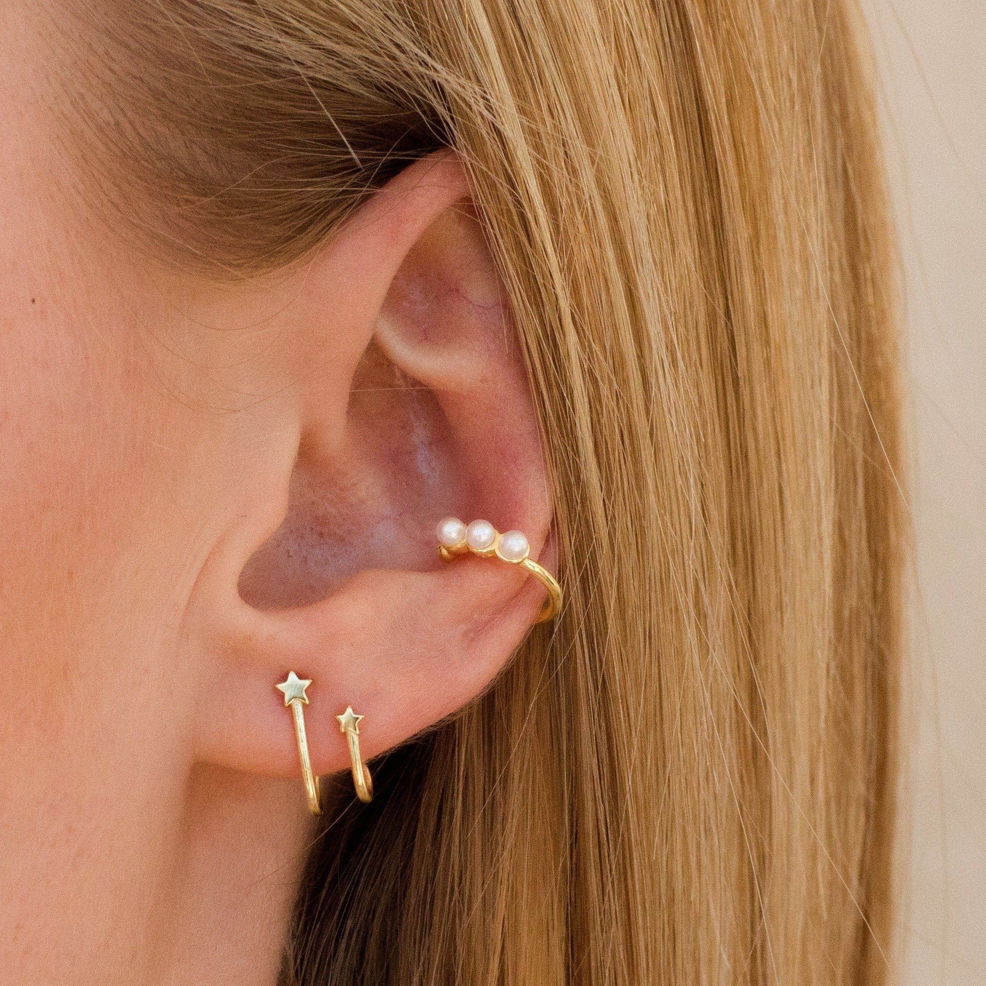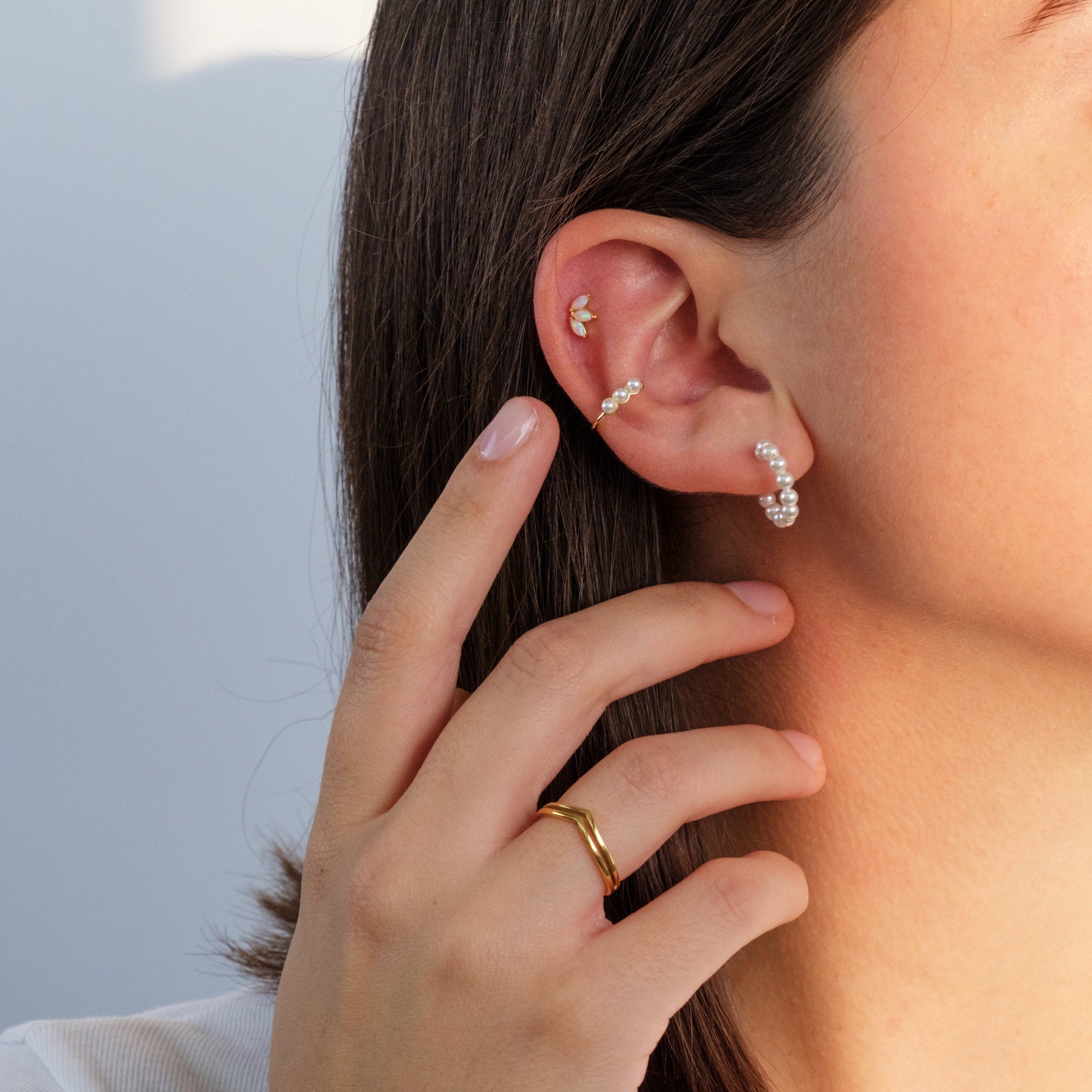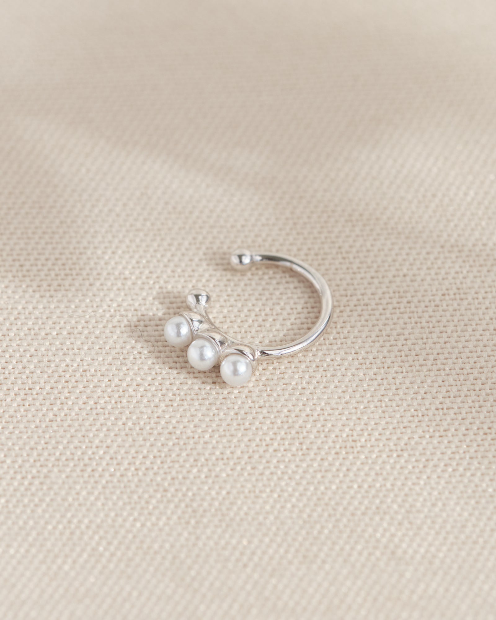 Un ear cuff delicato e luminoso, decorato con tre piccole perle che aggiungono eleganza e armonia al profilo dell’orecchio. Un design raffinato, perfetto per chi ama i dettagli minimal ma distintivi.