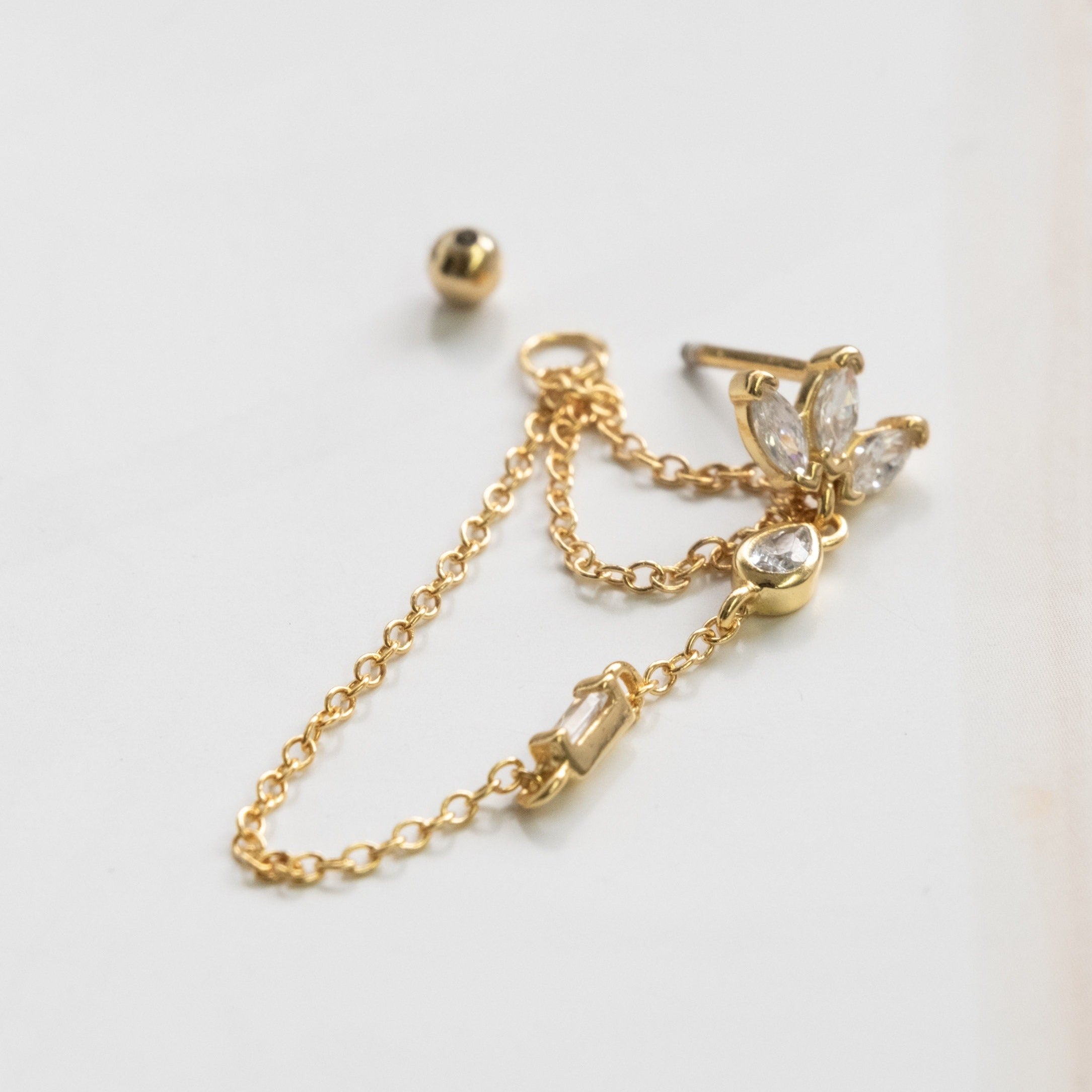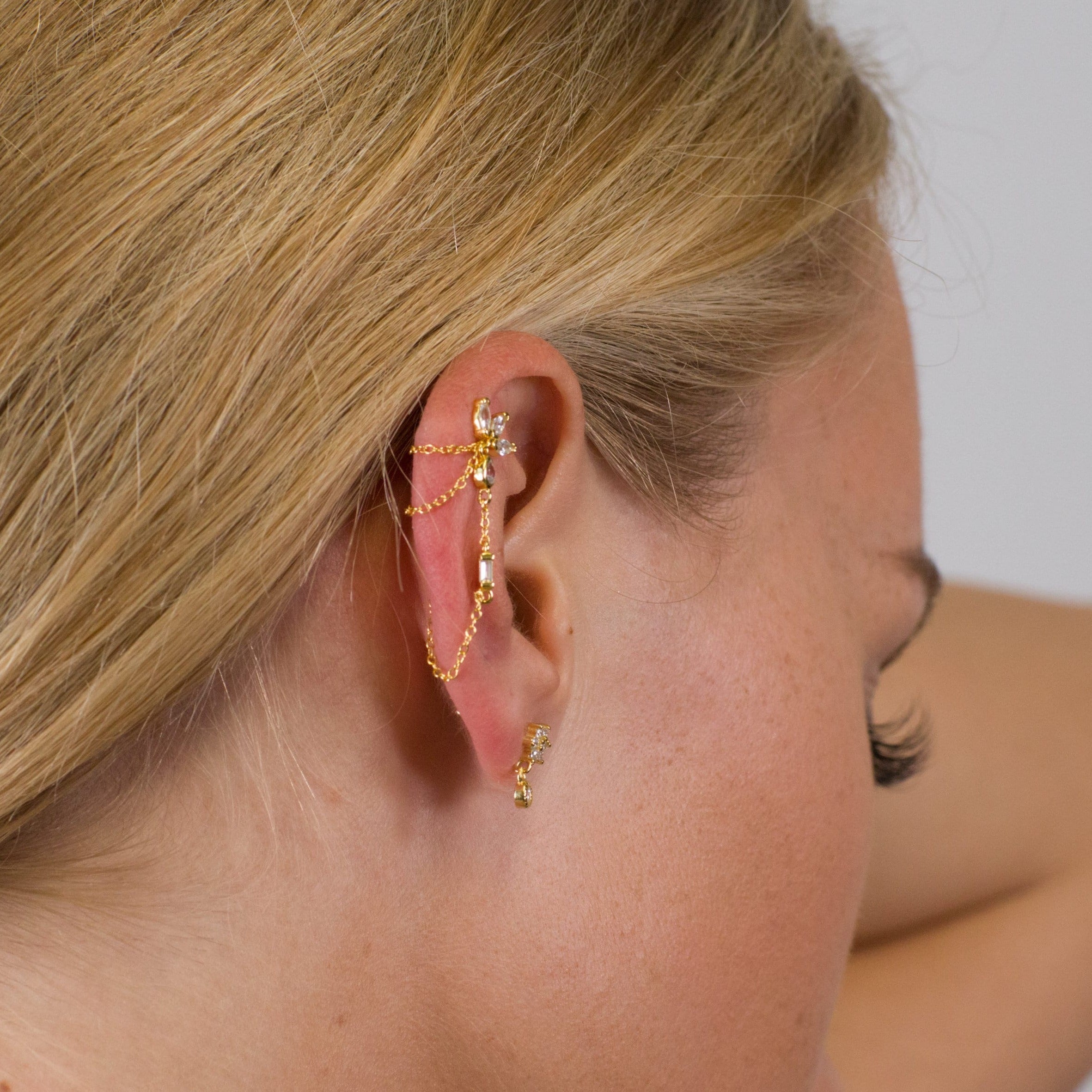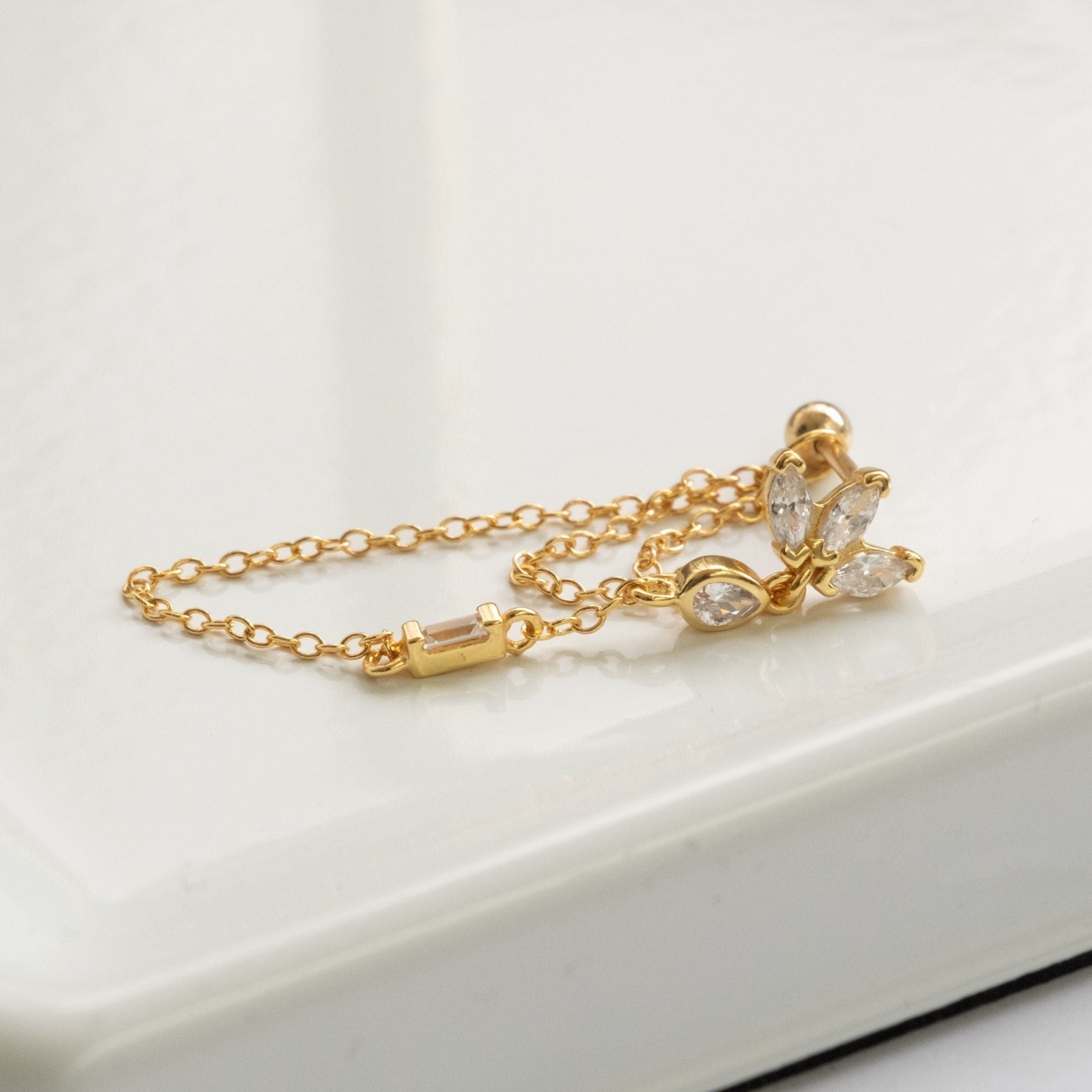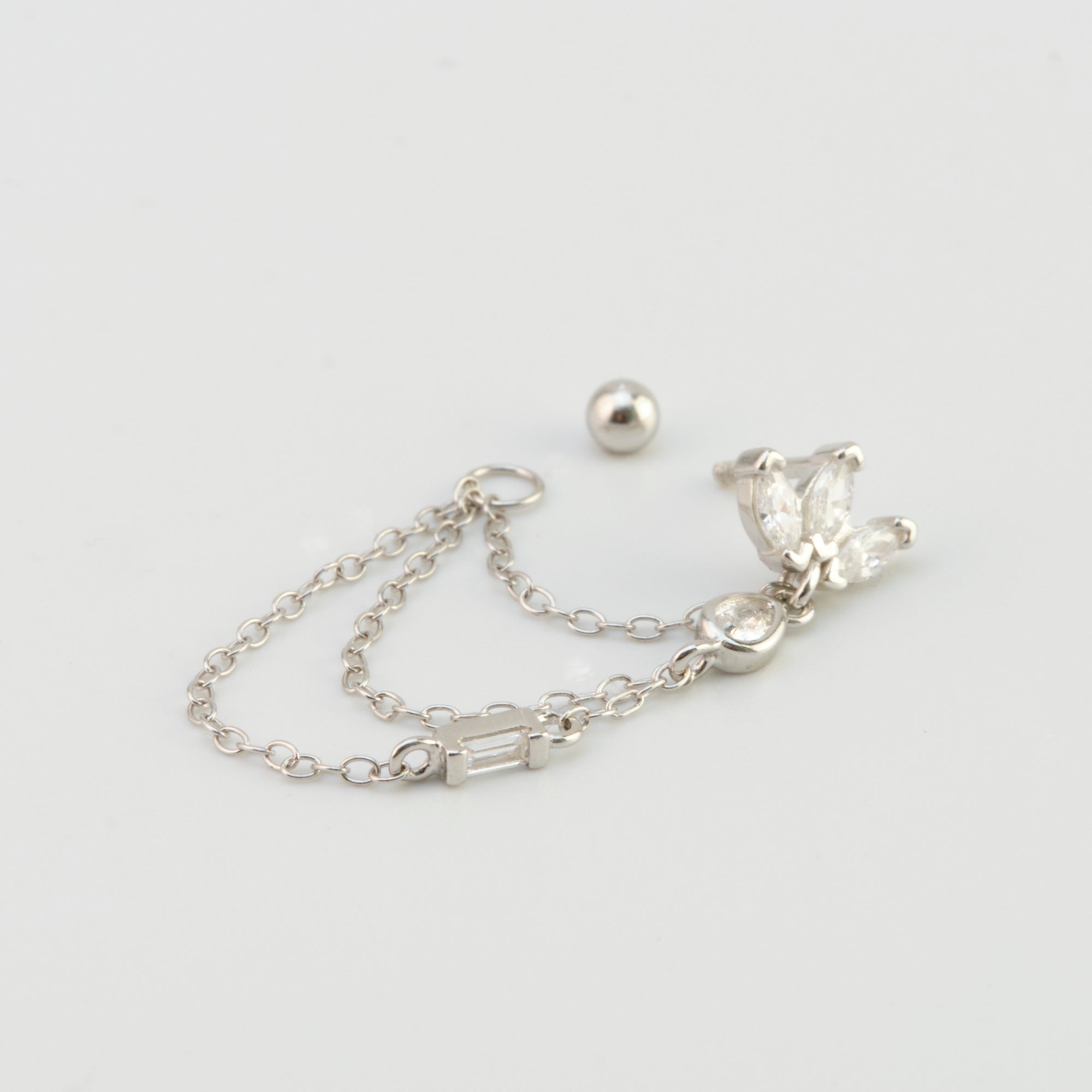 Piercing in argento 925 con placcatura in oro 18K o rodio, arricchito da zirconi bianchi e impreziosito da una sottile catena che collega il lobo alla parte alta dell’orecchio. Un orecchino singolo elegante e d’impatto, ideale per chi desidera un look moderno e sofisticato con un tocco di originalità.