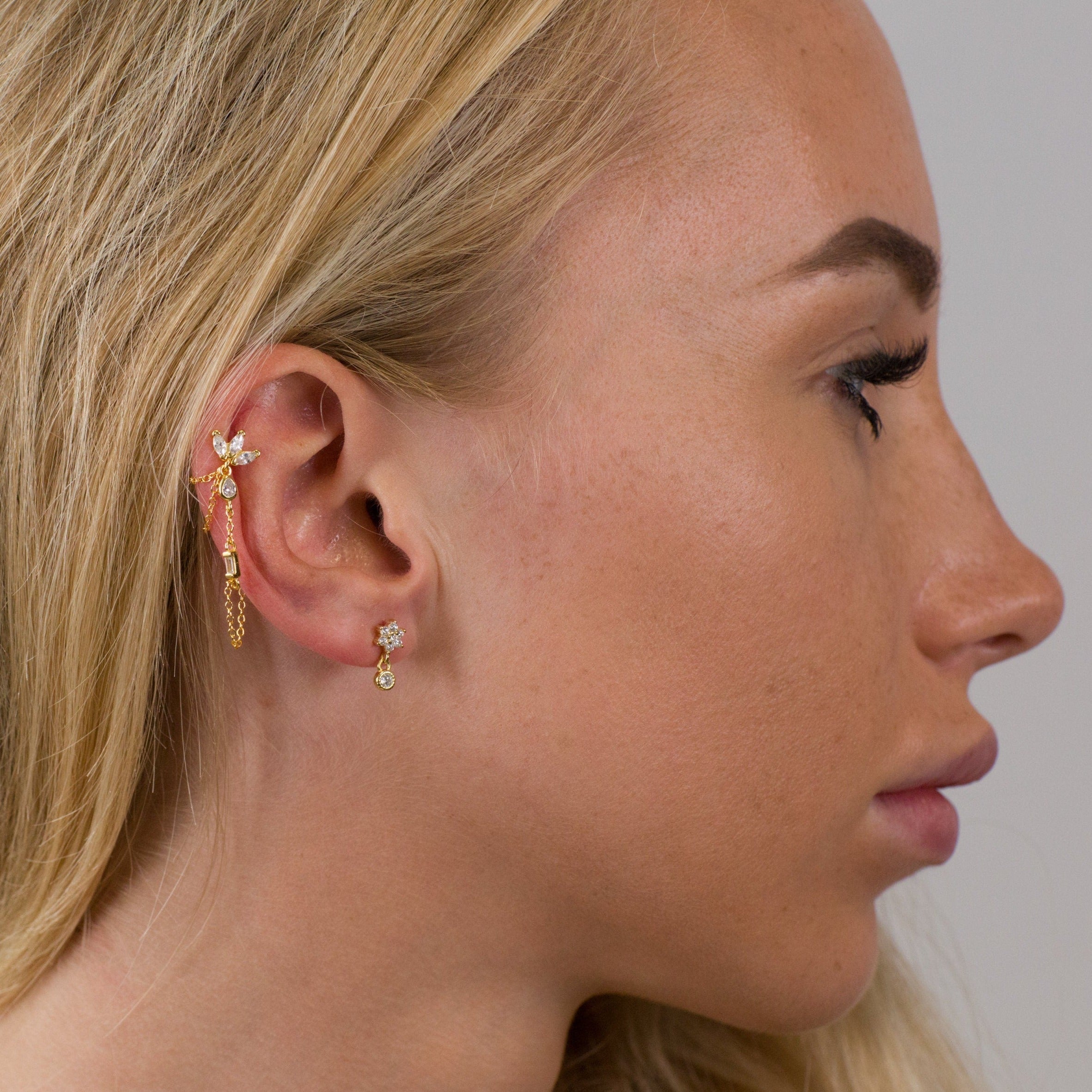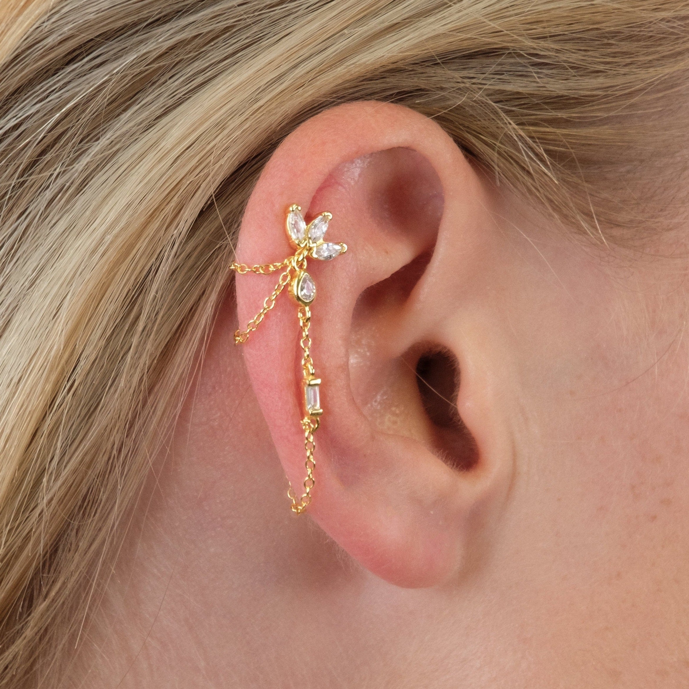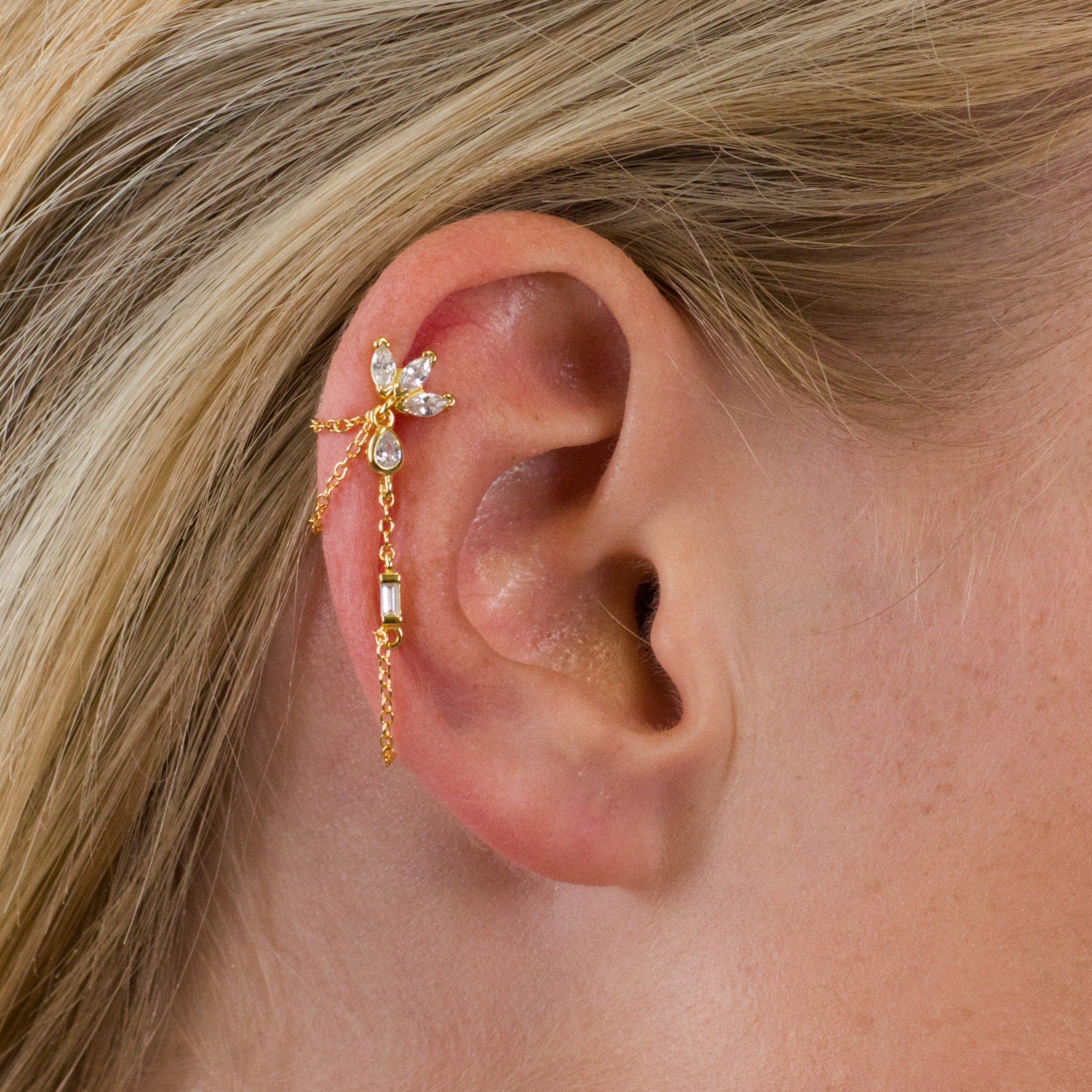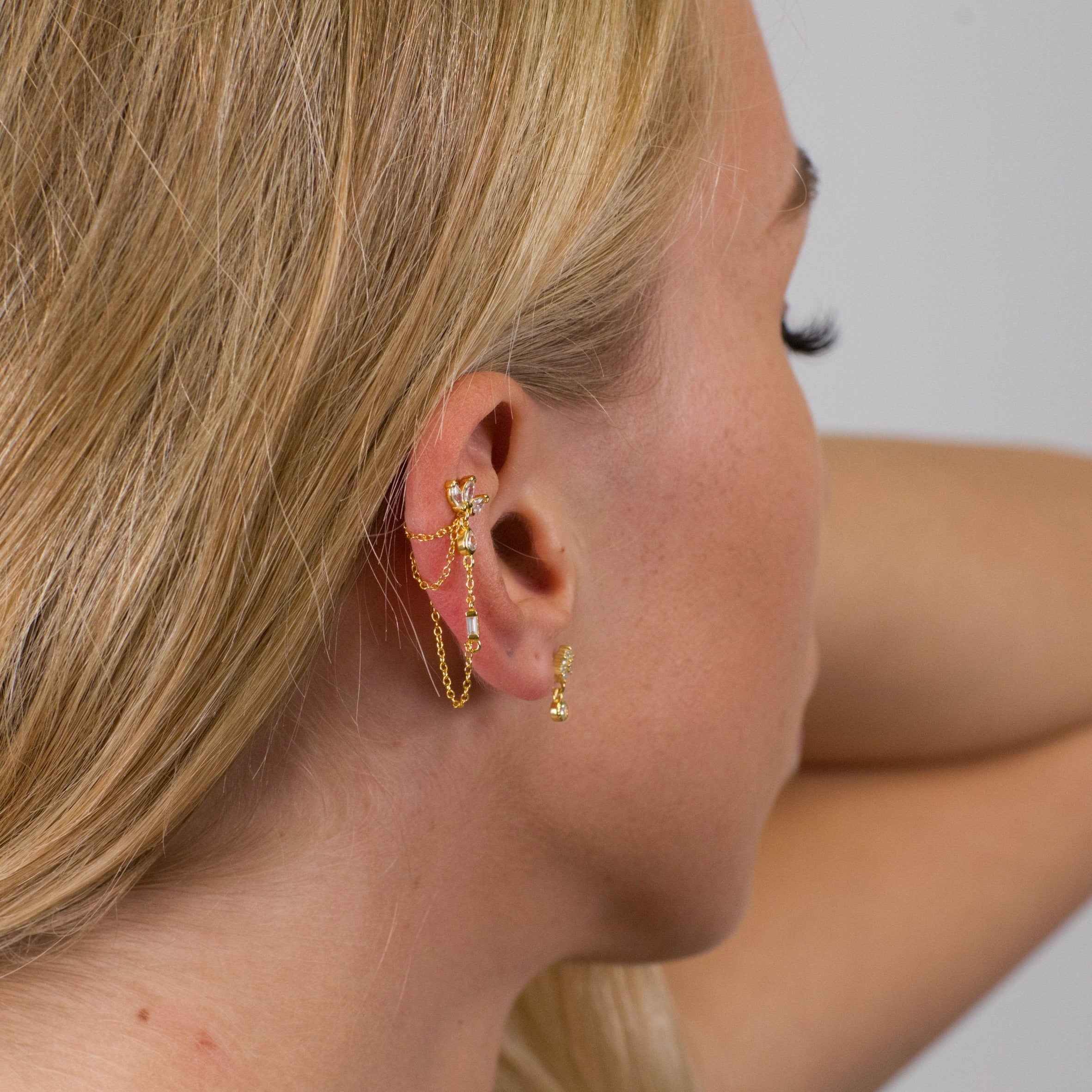 Piercing in argento 925 con placcatura in oro 18K o rodio, arricchito da zirconi bianchi e impreziosito da una sottile catena che collega il lobo alla parte alta dell’orecchio. Un orecchino singolo elegante e d’impatto, ideale per chi desidera un look moderno e sofisticato con un tocco di originalità.