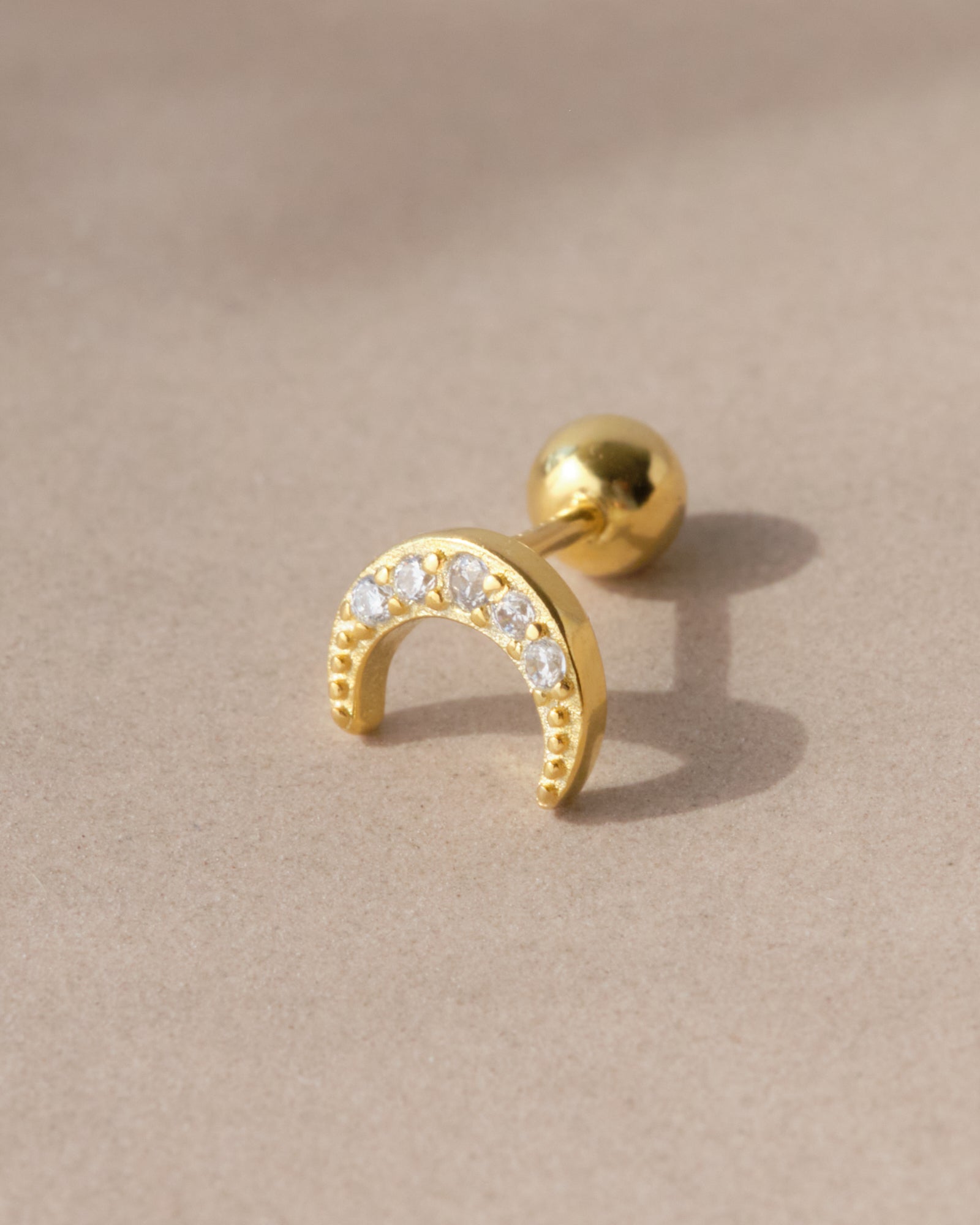 Piercing in argento 925 con placcatura in oro 18K o rodio, decorato da una luminosa mezzaluna impreziosita da zirconi bianchi dal taglio brillante. Un orecchino singolo elegante e simbolico, ideale per chi ama i dettagli raffinati e le combinazioni di piercing ispirate alla luce della notte.