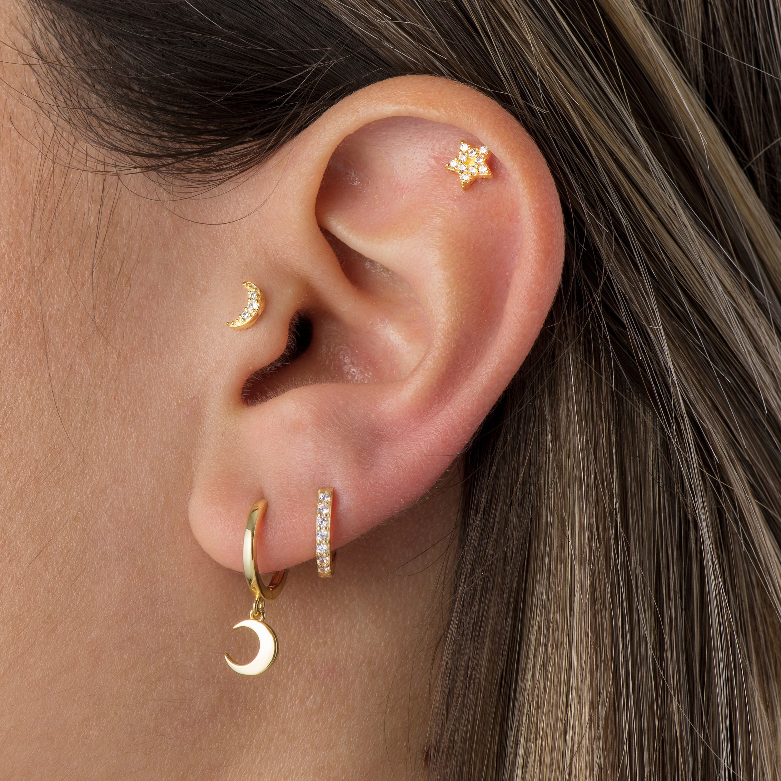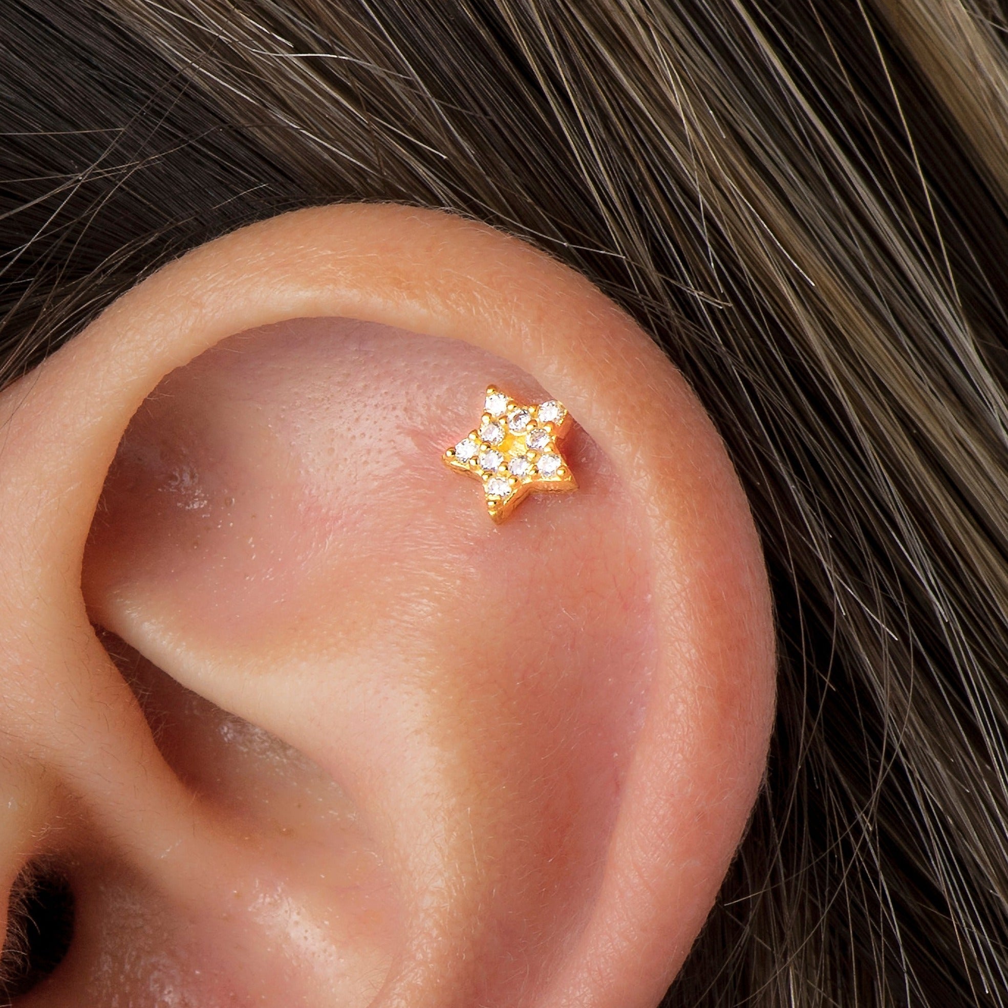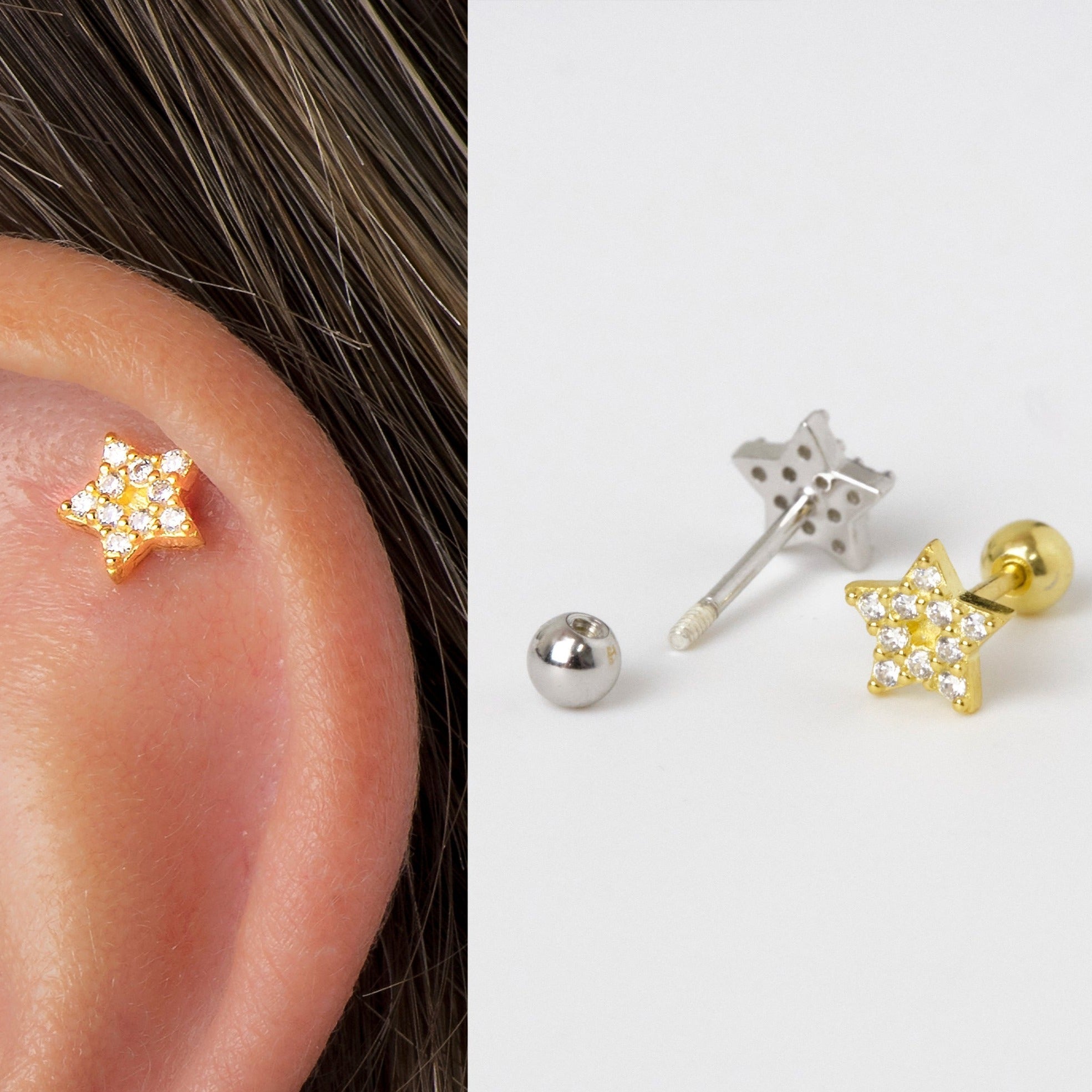 Piercing in argento 925 con placcatura in oro 18K o rodio, a forma di stella e interamente ricoperto da zirconi bianchi pavé dal taglio brillante. Un orecchino singolo luminoso e raffinato, perfetto per arricchire le tue combinazioni di piercing con un dettaglio scintillante e senza tempo.