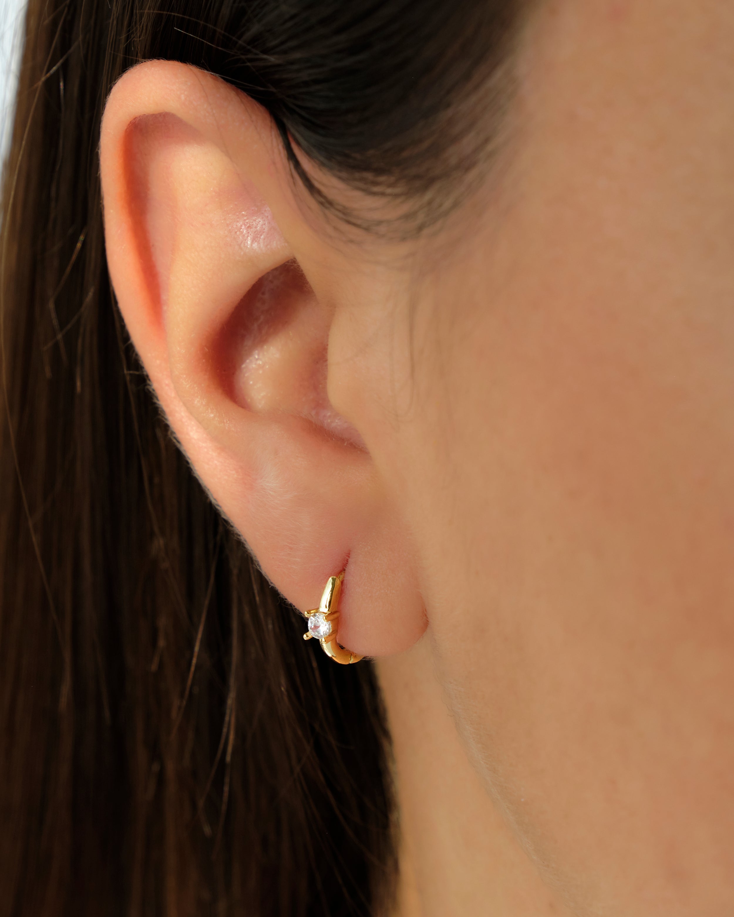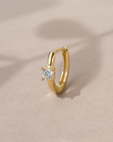 Mini cerchietto in argento 925 con placcatura in oro 18K o rodio, arricchito da un luminoso punto luce in zircone. Un orecchino essenziale ma elegante, ideale da indossare ogni giorno o da abbinare ad altri cerchietti per un look moderno e raffinato.