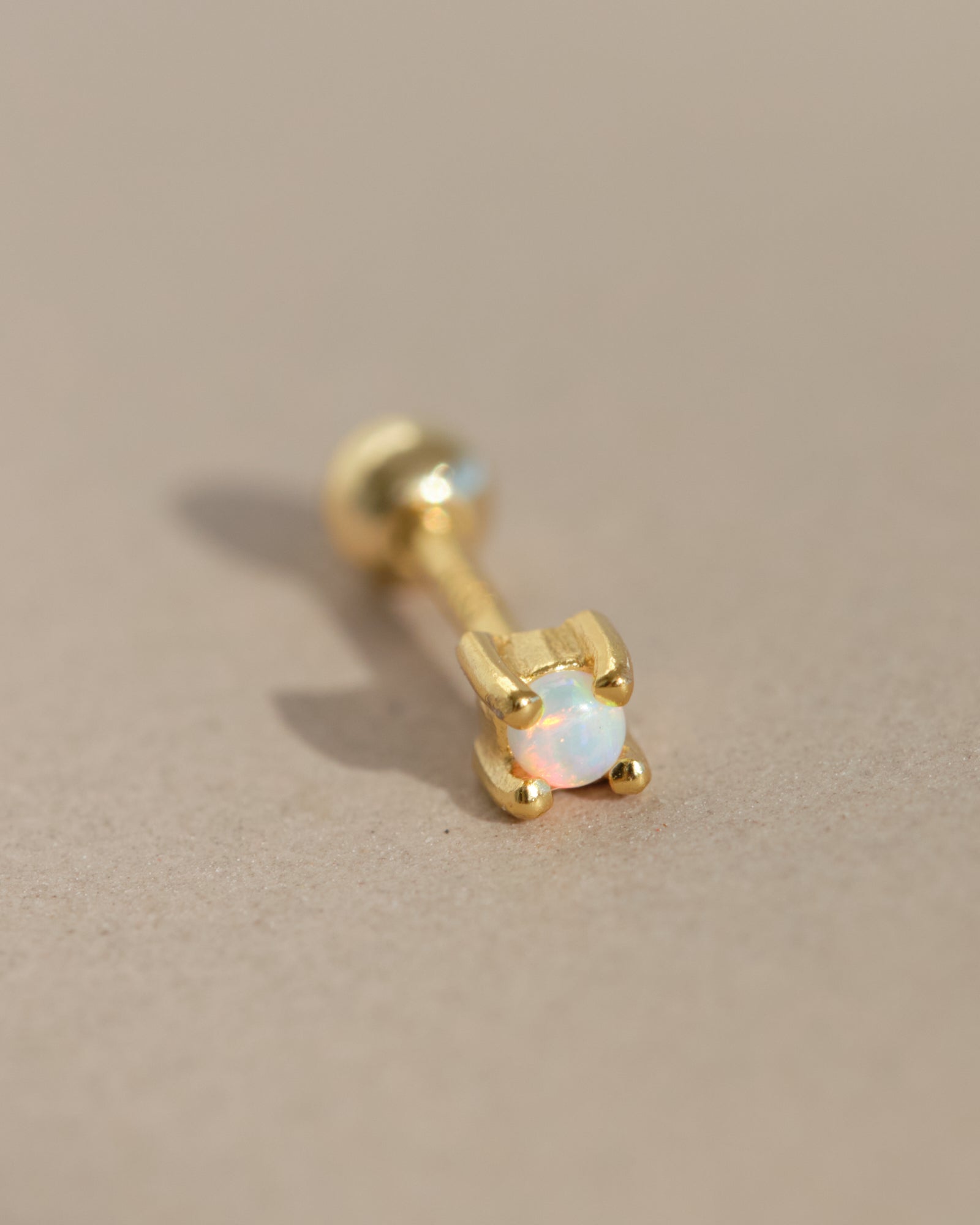 Piercing in argento 925 con placcatura in oro 18K o rodio, impreziosito da una pietra di opale bianco dal riflesso iridescente. Un orecchino singolo elegante e luminoso, perfetto per aggiungere un tocco delicato al tuo look quotidiano o completare una combinazione di piercing moderna e raffinata.