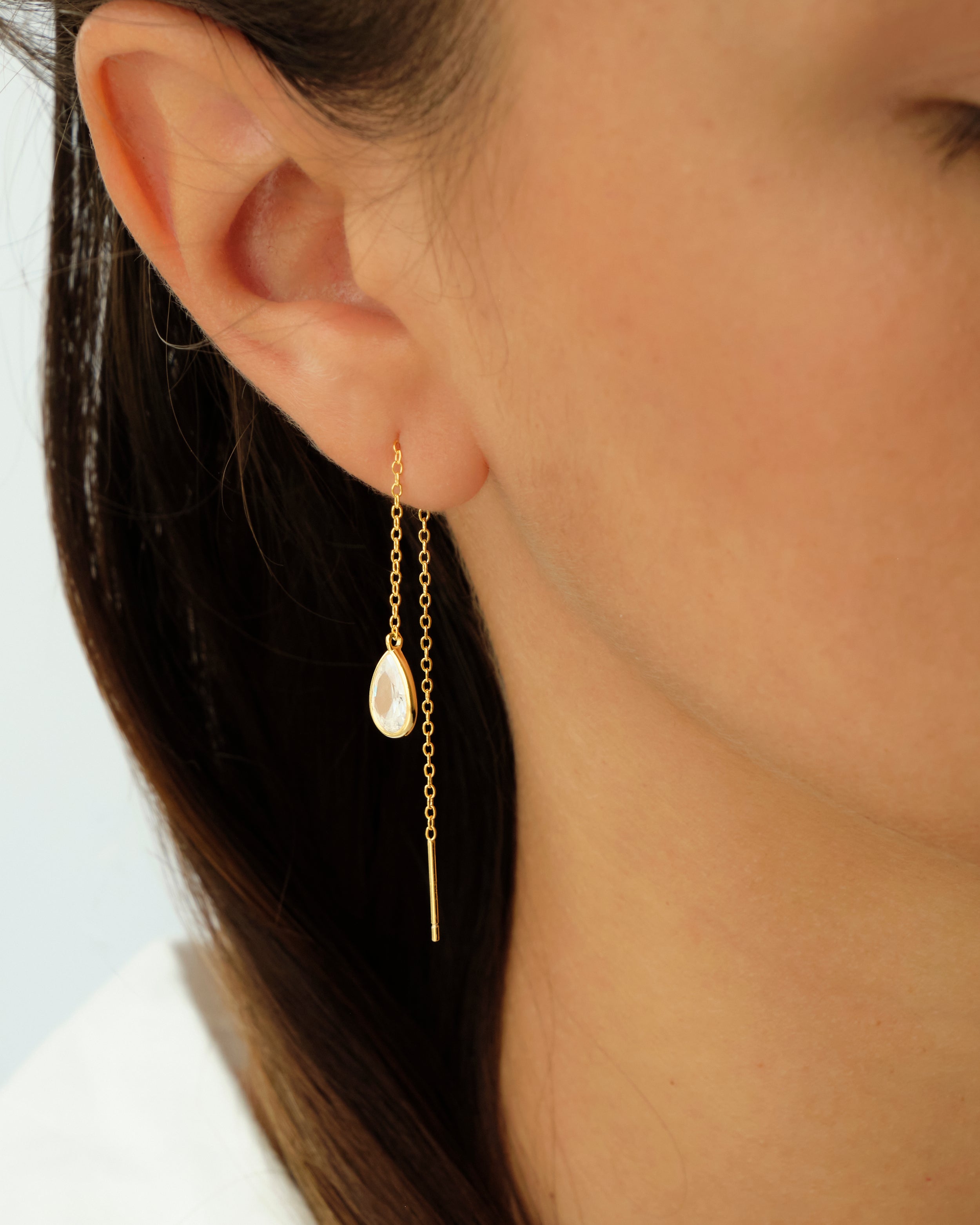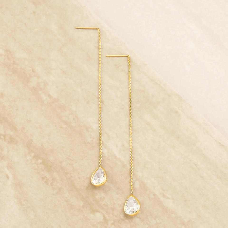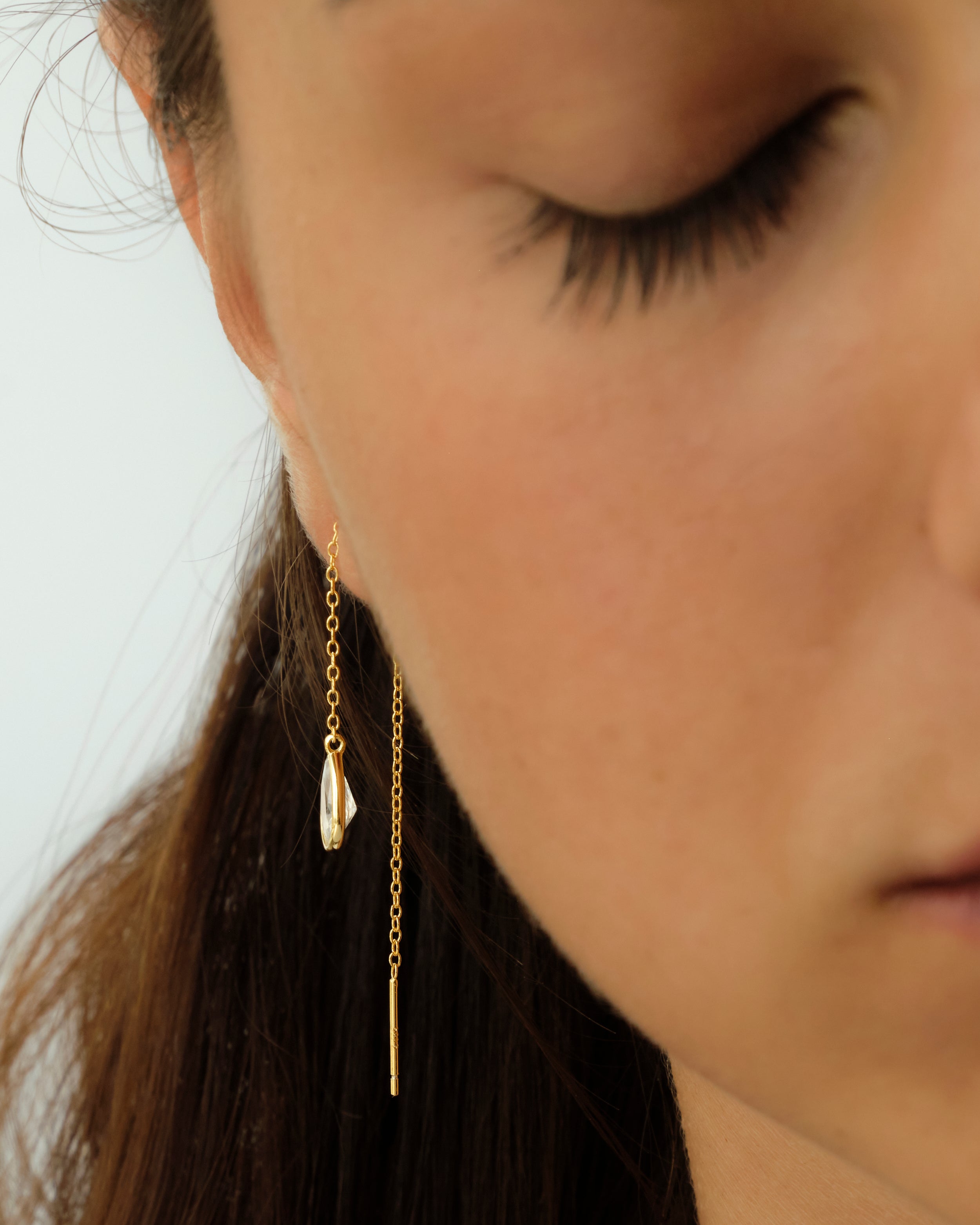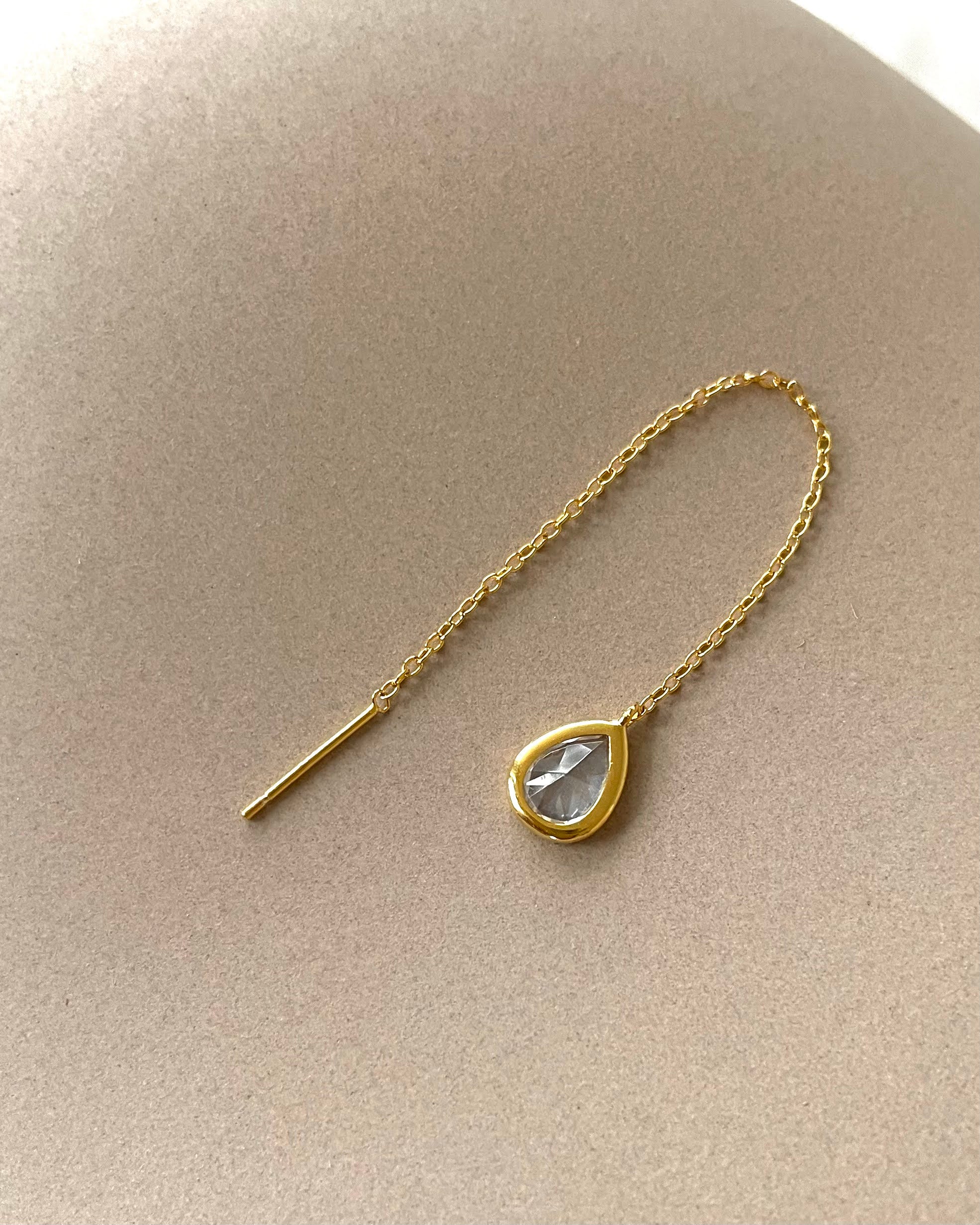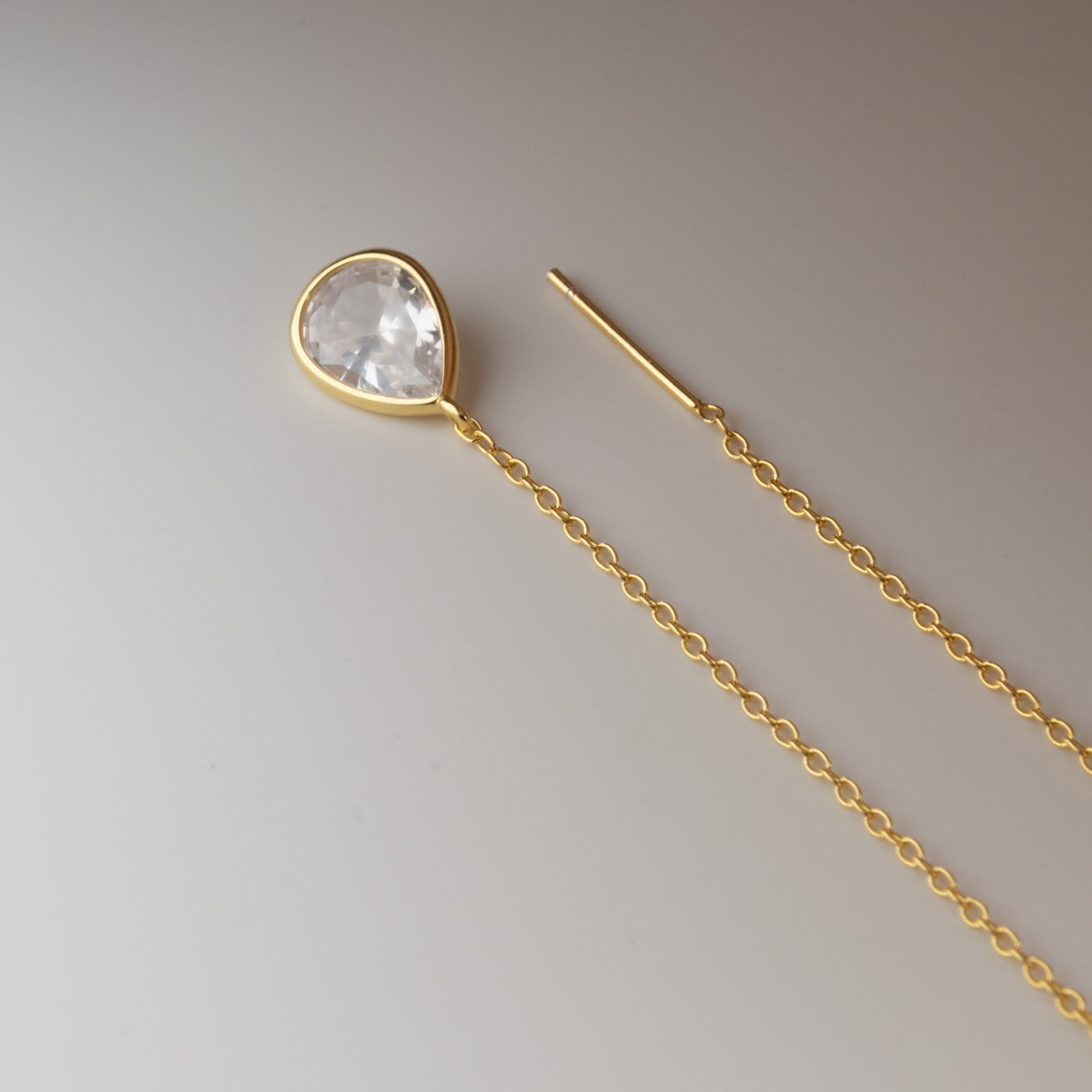 Orecchino a filo con catena sottile e pendente a goccia in cristallo bianco, che aggiunge un tocco di luminosità ad ogni movimento. Un design raffinato e moderno, ideale per chi cerca un accessorio leggero e d’effetto.