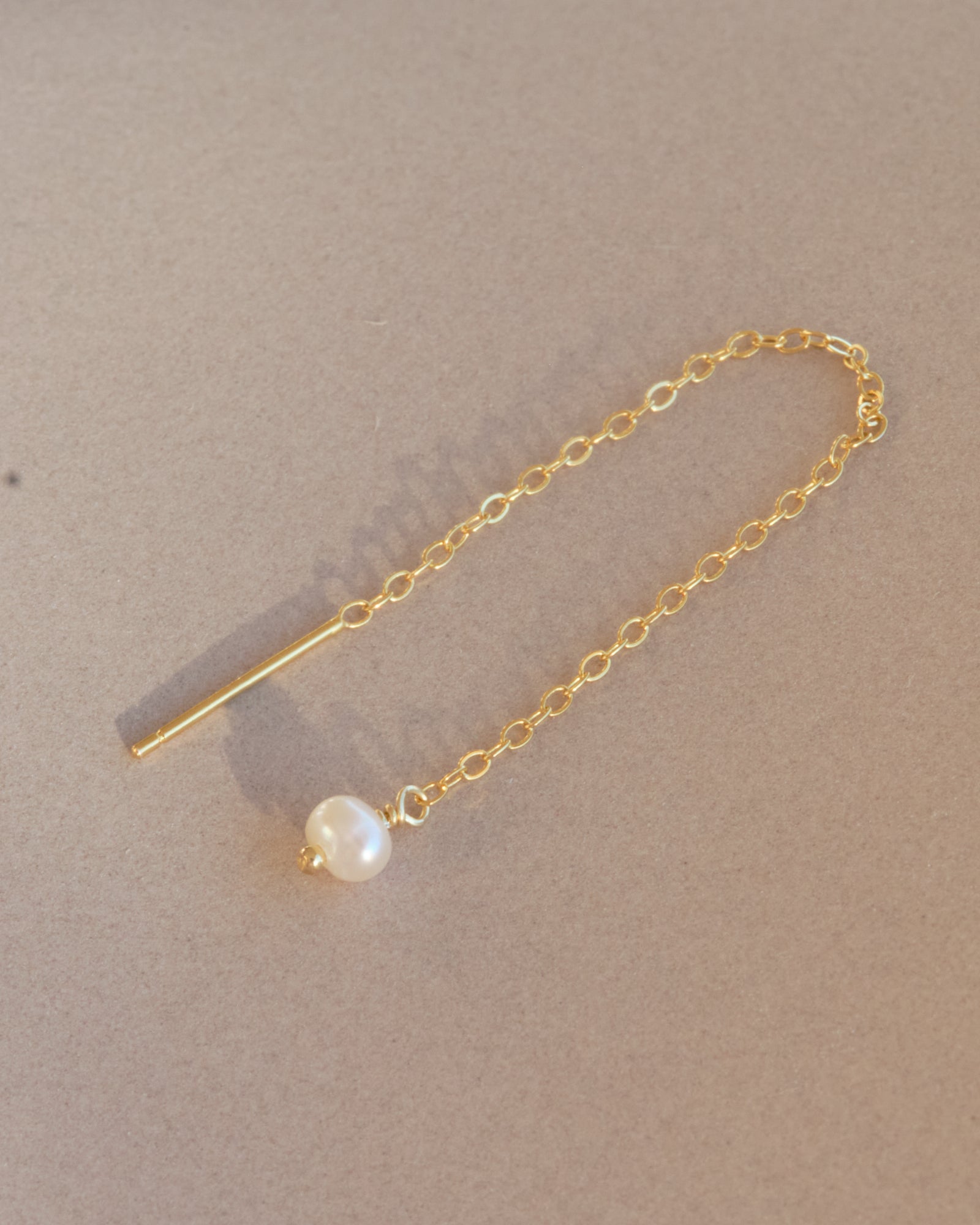 Orecchino a filo con catena sottile e pendente con perla naturale, simbolo di eleganza intramontabile. Un design raffinato e leggero, ideale per aggiungere un dettaglio delicato e luminoso ad ogni look.